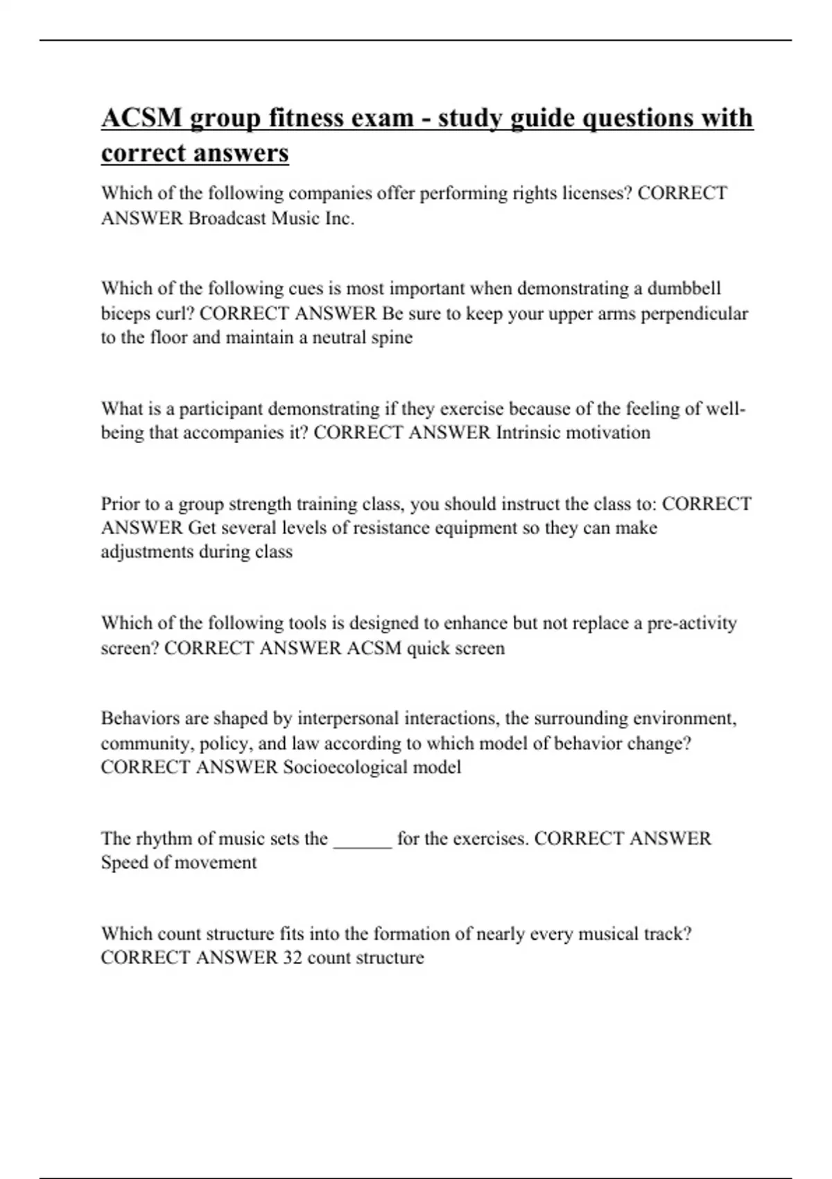 ACSM group fitness exam - study guide questions with correct answers