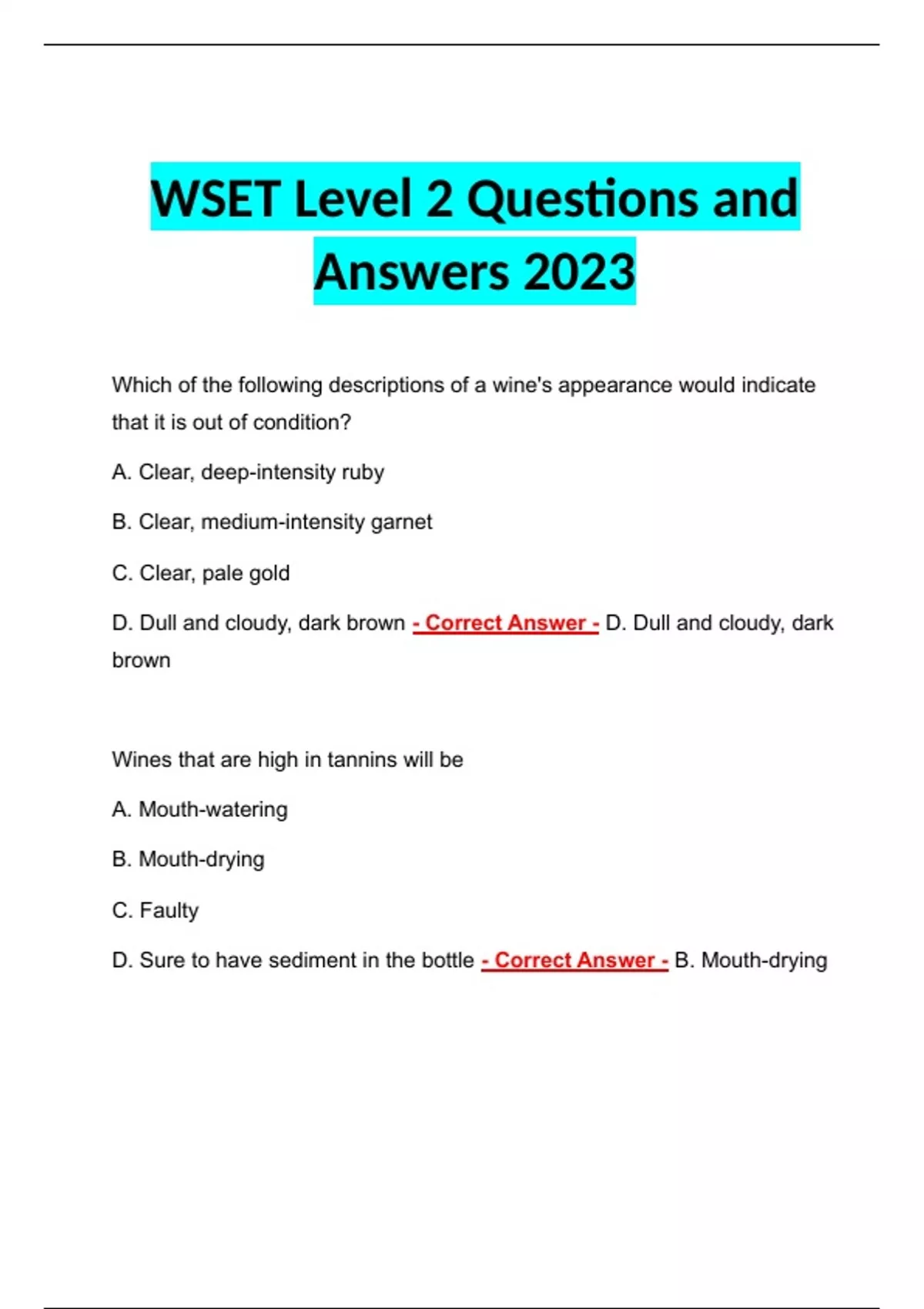 WSET Level 2 Questions and Answers 2023 WSET Level 2 Questions and Answers 2023 WSET Level 2 Questions and Answers 2023