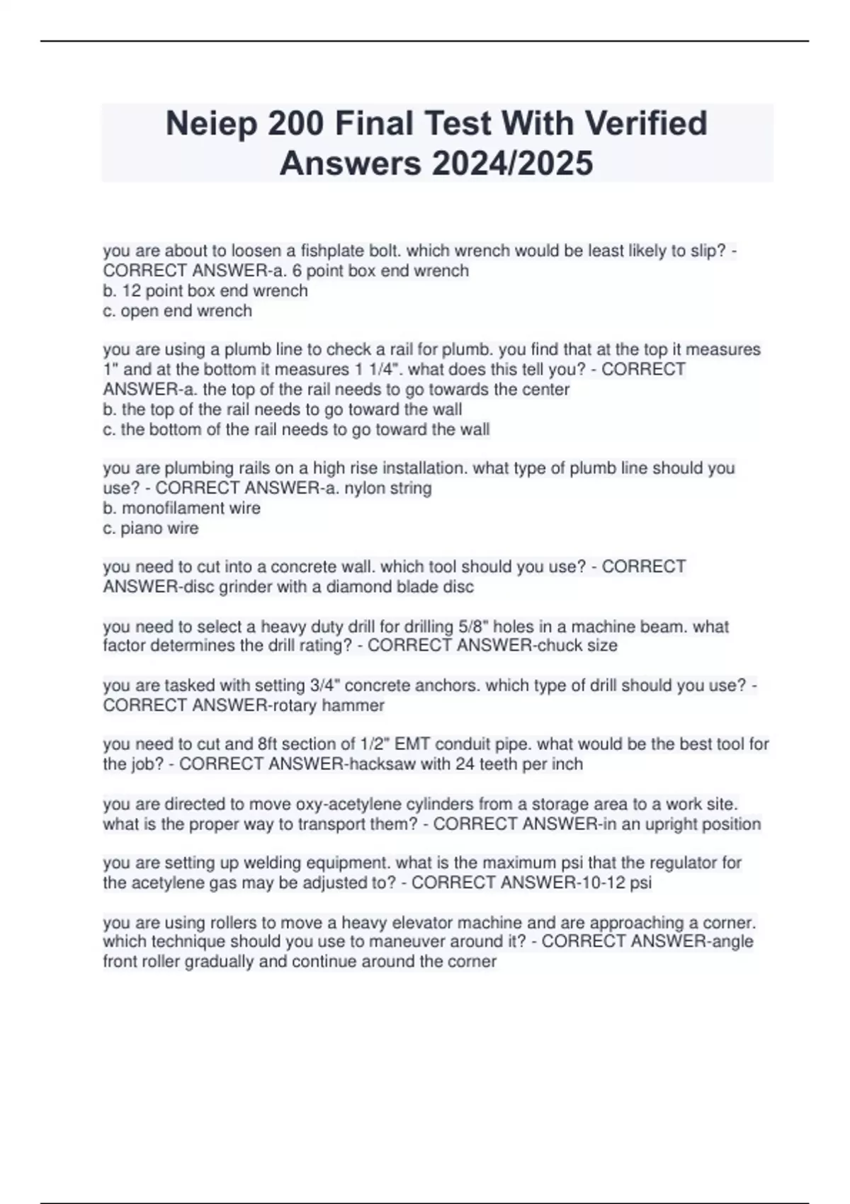 Neiep 200 Final Test With Verified Answers 2024/2025 you are about to loosen a fishplate bolt. which wrench would be least likely to slip? - CORRECT ANSWER-a. 6 point box end wrench b. 12 point box end wrench c. open end wrench you are using a plumb line to check a rail for plumb. you find that at the top it measures 1" and at the bottom it measures 1 1/4". what does this tell you? - CORRECT ANSWER-a. the top of the rail needs to go towards the center b. the top of the rail needs to go toward the wall c. the bottom of the rail needs to go toward the wall you are plumbing rails on a high rise installation. what type of plumb line should you use? - CORRECT ANSWER-a. nylon string b. monofilament wire c. piano wire you need to cut into a concrete wall. which tool should you use? - CORRECT ANSWER-disc grinder with a diamond blade disc you need to select a heavy duty drill for drilling 5/8" holes in a machine beam. what factor determines the drill rating? - CORRECT ANSWER-chuck size you are tasked with setting 3/4" concrete anchors. which type of drill should you use? - CORRECT ANSWER-rotary hammer you need to cut and 8ft section of 1/2" EMT conduit pipe. what would be the best tool for the job? - CORRECT ANSWER-hacksaw with 24 teeth per inch you are directed to move oxy-acetylene cylinders from a storage area to a work site. what is the proper way to transport them? - CORRECT ANSWER-in an upright position you are setting up welding equipment. what is the maximum psi that the regulator for the acetylene gas may be adjusted to? - CORRECT ANSWER-10-12 psi you are using rollers to move a heavy elevator machine and are approaching a corner. which technique should you use to maneuver around it? - CORRECT ANSWER-angle front roller gradually and continue around the corner you are preparing to unload a truck at the loading dock and the truck is 8" higher than the dock. what do you do? - CORRECT ANSWER-use a steel plate to span the gap