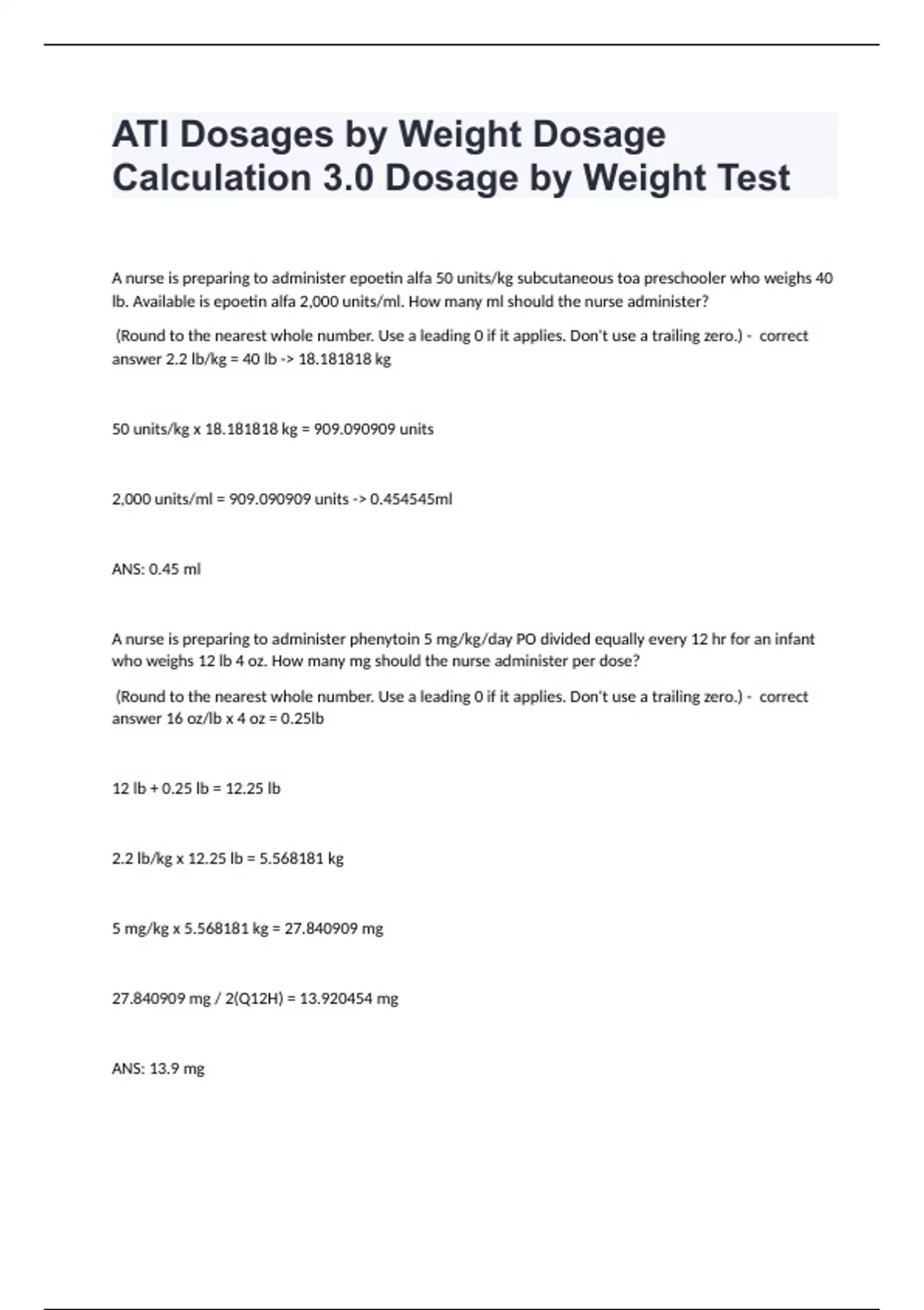 ATI Dosages by Weight Dosage Calculation 3.0 Dosage by Weight Test A nurse is preparing to administer epoetin alfa 50 units/kg subcutaneous toa preschooler who weighs 40 lb. Available is epoetin alfa 2,000 units/ml. How many ml should the nurse administer? (Round to the nearest whole number. Use a leading 0 if it applies. Don't use a trailing zero.) - correct answer 2.2 lb/kg = 40 lb -> 18.181818 kg 50 units/kg x 18.181818 kg = 909.090909 units 2,000 units/ml = 909.090909 units -> 0.454545ml ANS: 0.45 ml A nurse is preparing to administer phenytoin 5 mg/kg/day PO divided equally every 12 hr for an infant who weighs 12 lb 4 oz. How many mg should the nurse administer per dose? (Round to the nearest whole number. Use a leading 0 if it applies. Don't use a trailing zero.) - correct answer 16 oz/lb x 4 oz = 0.25lb 12 lb + 0.25 lb = 12.25 lb 2.2 lb/kg x 12.25 lb = 5.568181 kg 5 mg/kg x 5.568181 kg = 27.840909 mg 27.840909 mg / 2(Q12H) = 13.920454 mg ANS: 13.9 mg