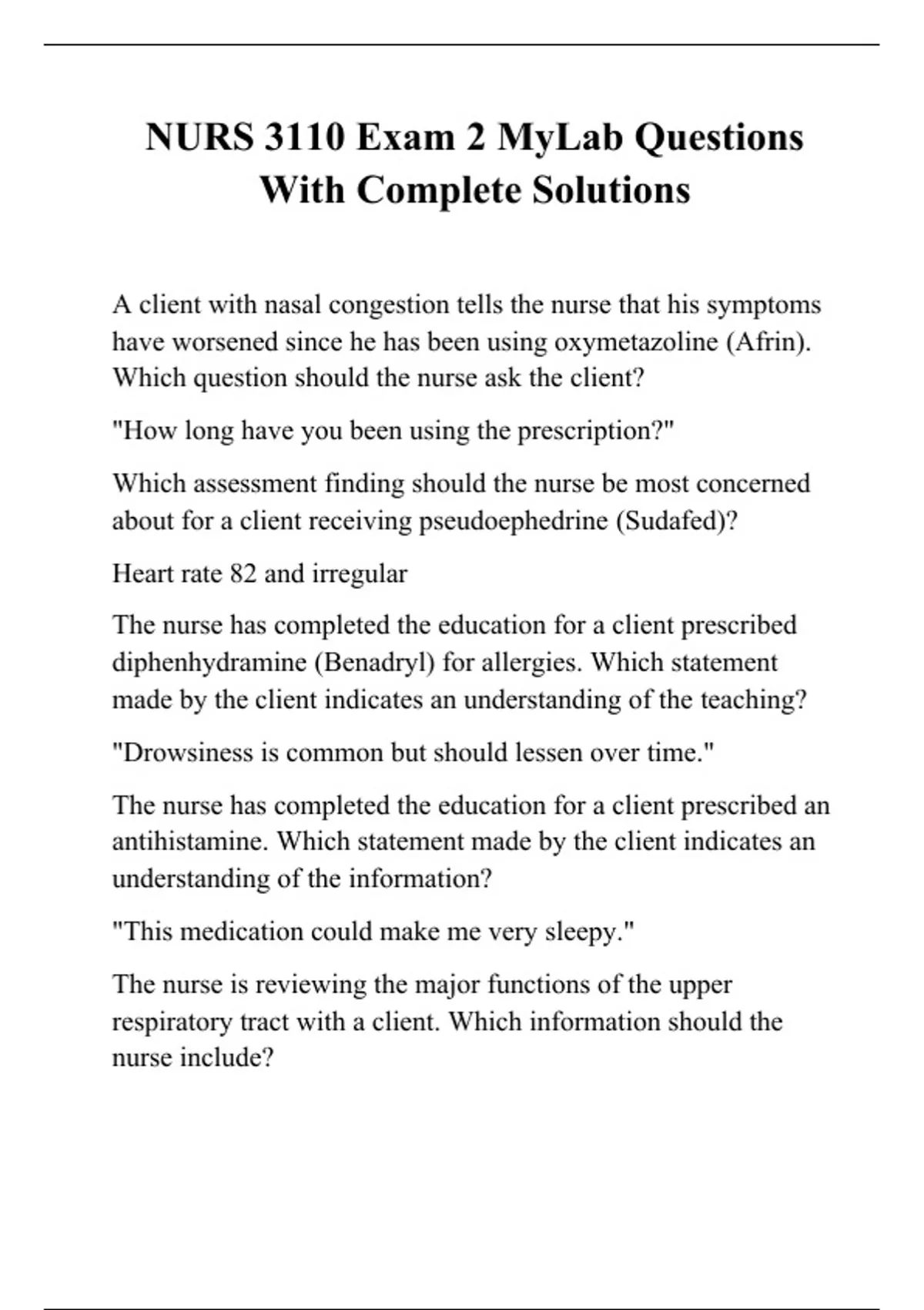 NURS 3110 Exam 2 MyLab Questions With Complete Solutions