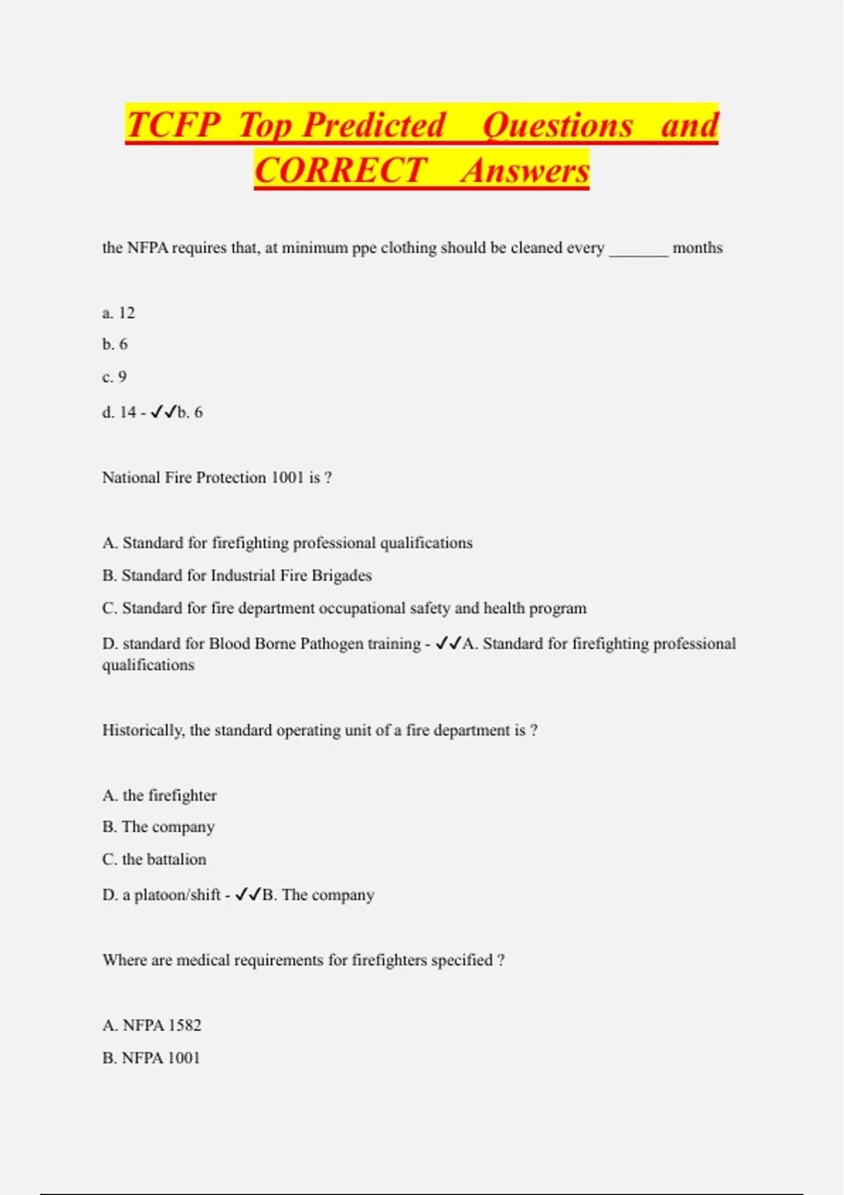 the NFPA requires that, at minimum ppe clothing should be cleaned every _______ months a. 12 b. 6 c. 9 d. 14 - b. 6 National Fire Protection 1001 is ? A. Standard for firefighting professional qualifications B. Standard for Industrial Fire Brigades C. Standard for fire department occupational safety and health program D. standard for Blood Borne Pathogen training - A. Standard for firefighting professional qualifications