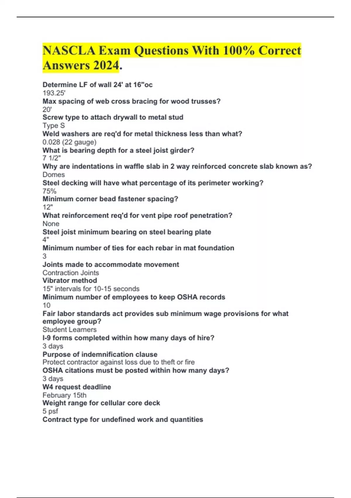 NASCLA Exam Questions With 100% Correct Answers 2024. Determine LF of wall 24' at 16"oc 193.25' Max spacing of web cross bracing for wood trusses? 20' Screw type to attach drywall to metal stud Type S Weld washers are req'd for metal thickness less than what? 0.028 (22 gauge) What is bearing depth for a steel joist girder? 7 1/2" Why are indentations in waffle slab in 2 way reinforced concrete slab known as? Domes Steel decking will have what percentage