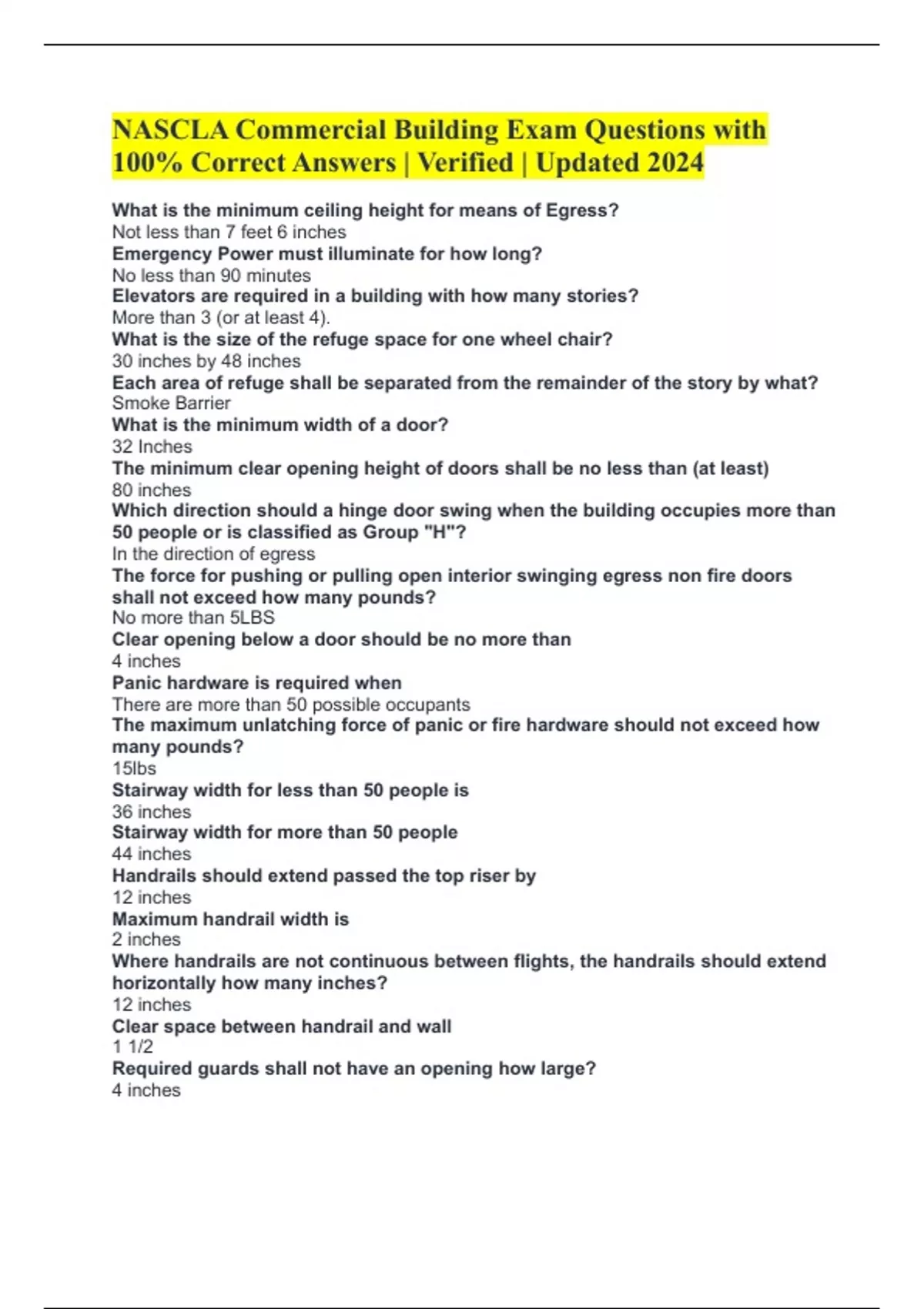 NASCLA Commercial Building Exam Questions with 100% Correct Answers | Verified | Updated 2024 What is the minimum ceiling height for means of Egress? Not less than 7 feet 6 inches Emergency Power must illuminate for how long? No less than 90 minutes Elevators are required in a building with how many stories? More than 3 (or at least 4). What is the size of the refuge space for one wheel chair? 30 inches by 48 inches Each area of refuge shall be separated from the remainder of the story by what? Smoke Barrier What is the minimum width of a door? 32 Inches The minimum clear opening height of doors shall be no less than (at least) 80 inches Which direction should a hinge door swing when the building occupies more than 50 people or is classified as Group "H"? In the direction of egress The force for pushing or pulling open interior swinging egress non fire doors shall not exceed how many pounds? No more than 5LBS Clear opening below a door should be no more than 4 inches Panic hardware is required when There are more than 50 possible occupants The maximum unlatching force of panic or fire hardware should not exceed how many pounds? 15lbs Stairway width for less than 50 people is 36 inches Stairway width for more than 50 people 44 inches Handrails should extend passed the top riser by 12 inches Maximum handrail width is 2 inches Where handrails are not continuous between flights, the handrails should extend horizontally how many inches? 12 inches Clear space between handrail and wall 1 1/2 Required guards shall not have an opening how large? 4 inches