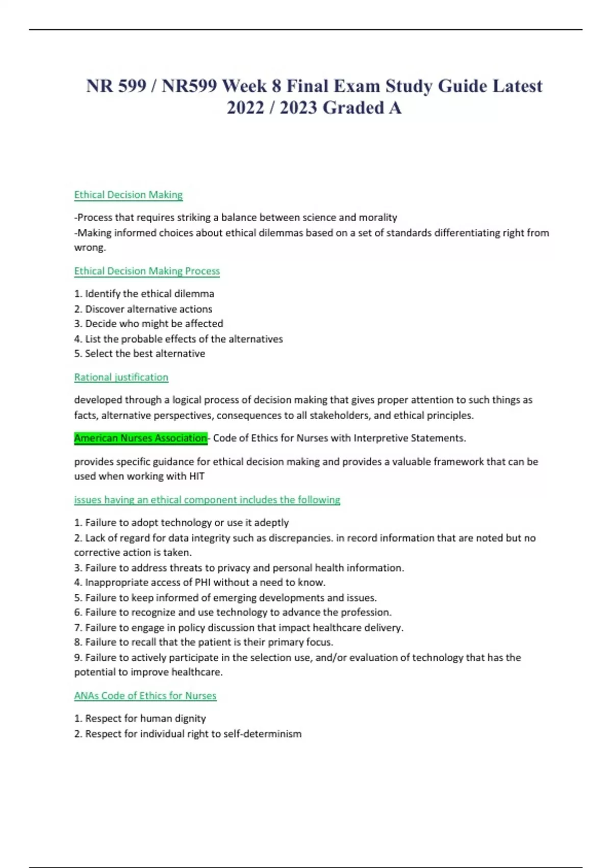 NR599 Week 8 Latest Final Exam Study Guide 2023 / 2024