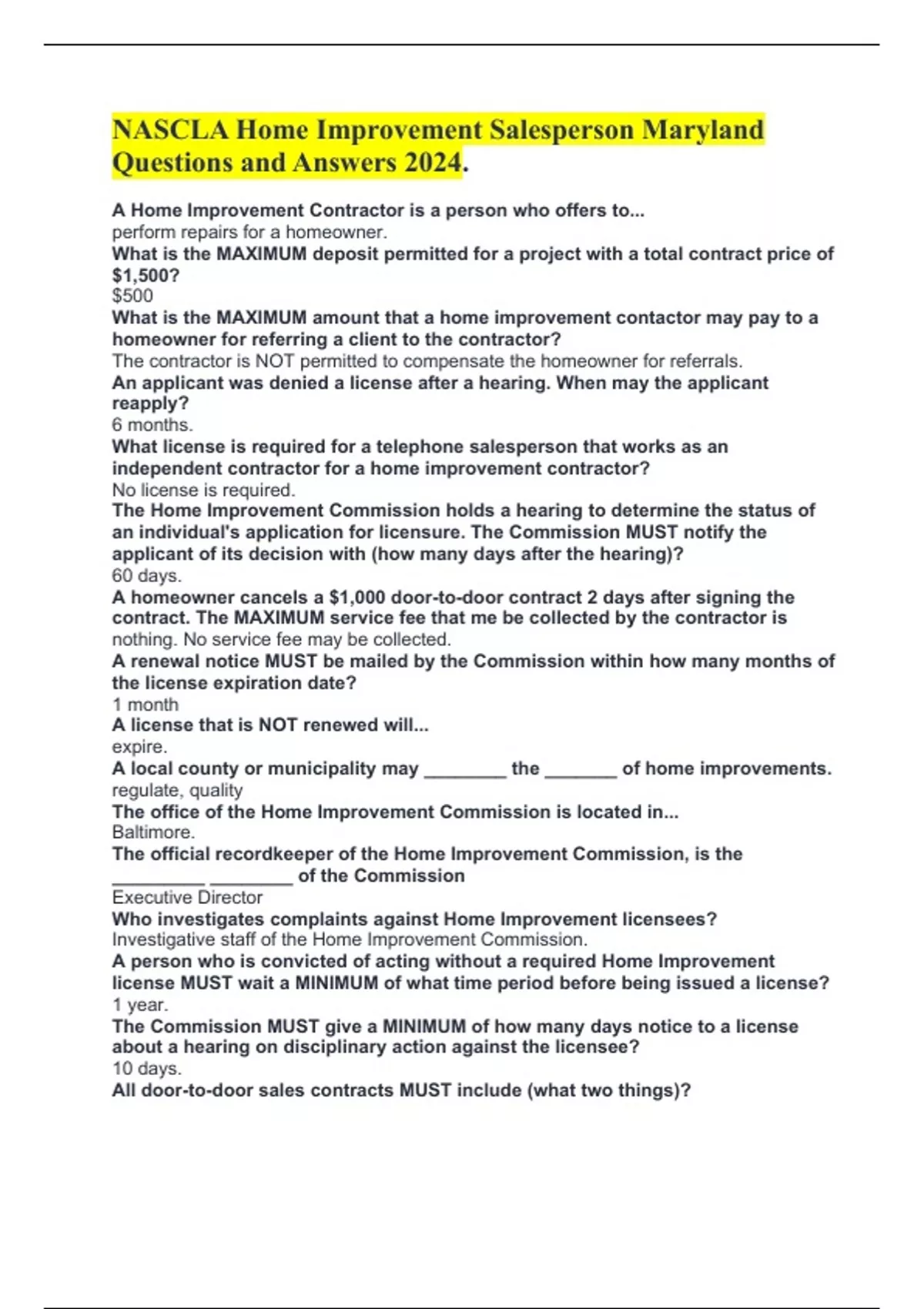 NASCLA Home Improvement Salesperson Maryland Questions and Answers 2024.