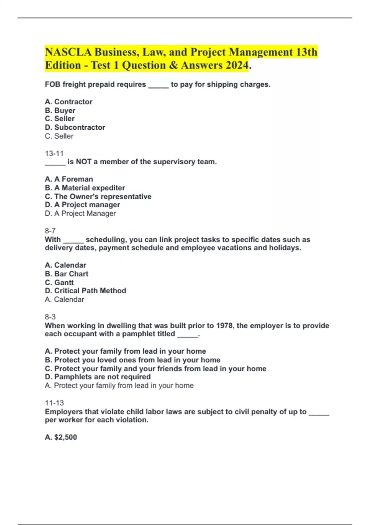NASCLA Business, Law, and Project Management 13th Edition - Test 1 Question & Answers 2024. FOB freight prepaid requires _____ to pay for shipping charges. A. Contractor B. Buyer C. Seller D. Subcontractor C. Seller 13-11 _____ is NOT a member of the supervisory team. A. A Foreman B. A Material expediter C. The Owner's representative D. A Project manager D. A Project Manager 8-7 With _____ scheduling, you can link project tasks to specific dates such as delivery dates, payment schedule and employee vacations and holidays. A. Calendar B. Bar Chart C. Gantt D. Critical Path Method A. Calendar 8-3 When working in dwelling that was built prior to 1978, the employer is to provide each occupant with a pamphlet titled _____. A. Protect your family from lead in your home B. Protect you loved ones from lead in your home C. Protect your family and your friends from lead in your home D. Pamphlets are not required A. Protect your family from lead in your home 11-13 Employers that violate child labor laws are subject to civil penalty of up to _____ per worker for each violation. A. $2,500