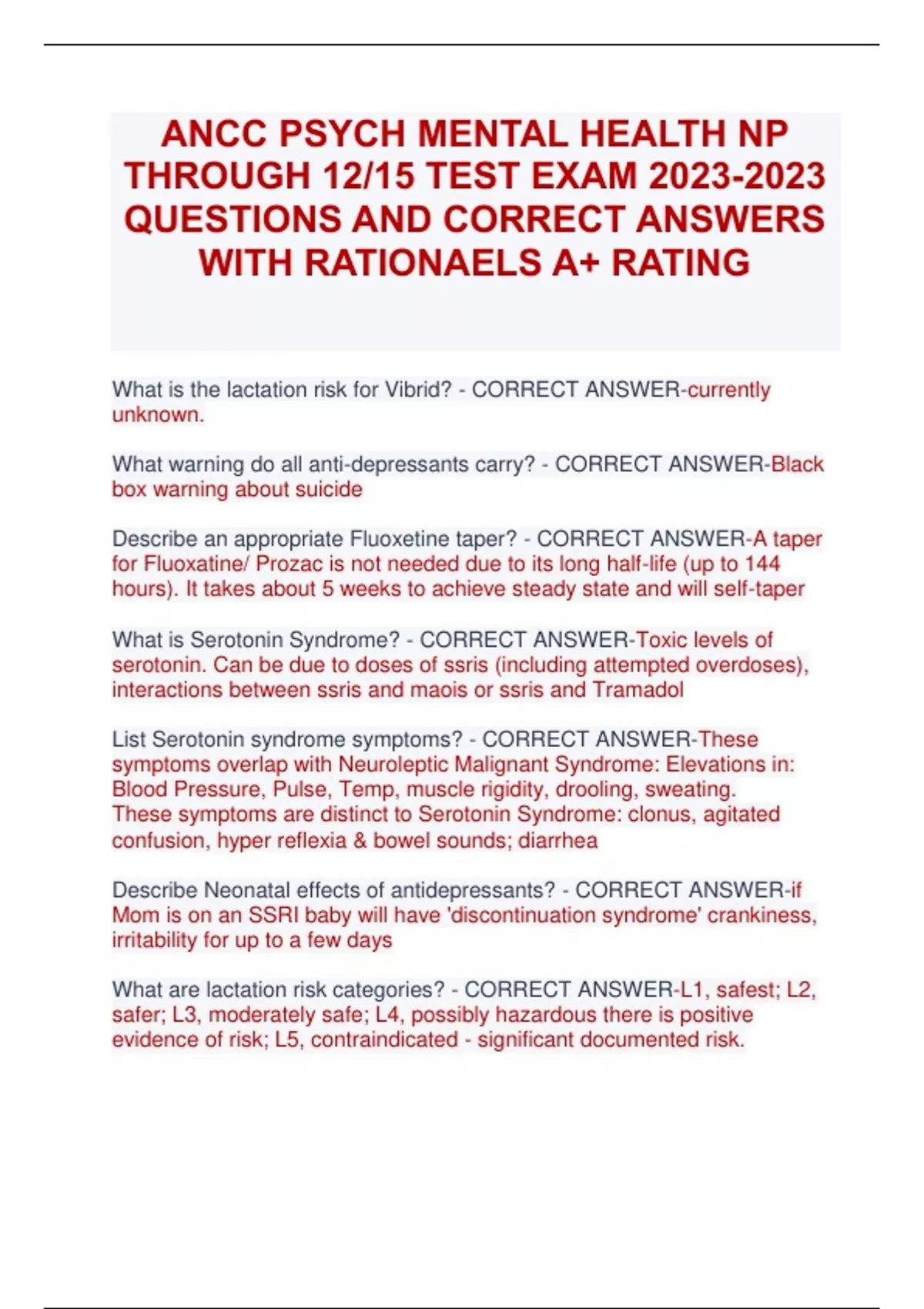ANCC PMHNP PSYCH-MENTAL HEALTH NP EXAM LATEST (TEST 1 ,2,& 3 ) QS & ANS PLUS RATIONALE (TEST 1-3 LATEST VERSIONS 100 QS AND ANS EACH) | NEW VERSION ALREADY GRADED A