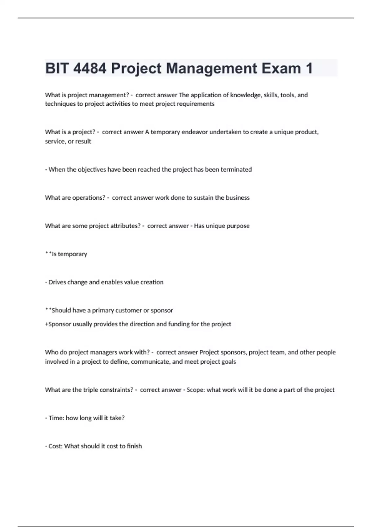 BIT 4484 Project Management Exam 1 questions and answers certified to pass 2024