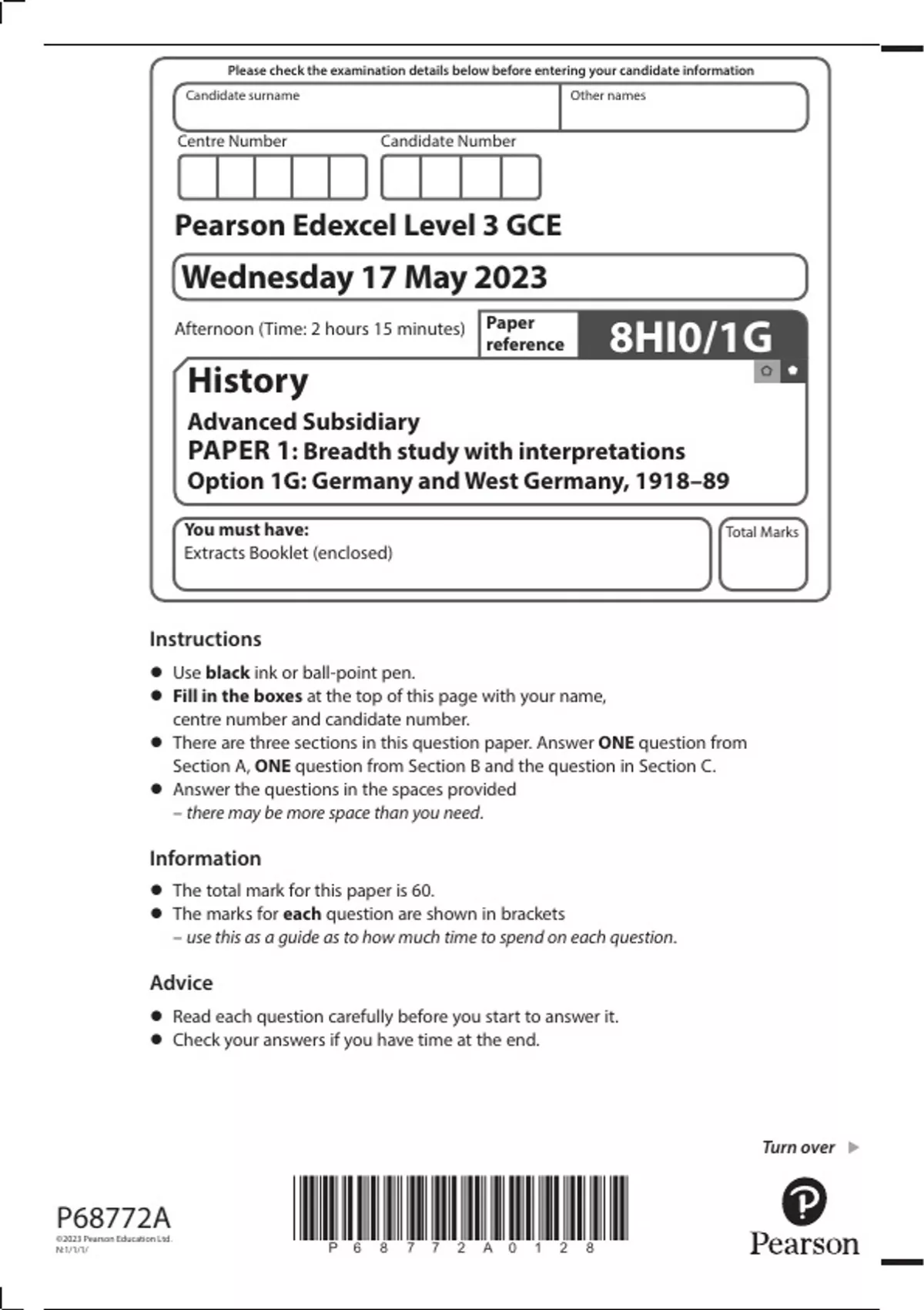 2023 pearson edexcel merged question and mark scheme History Advanced Subsidiary PAPER 1: Breadth study with interpretations Option 1G: Germany and West Germany, 1918–89
