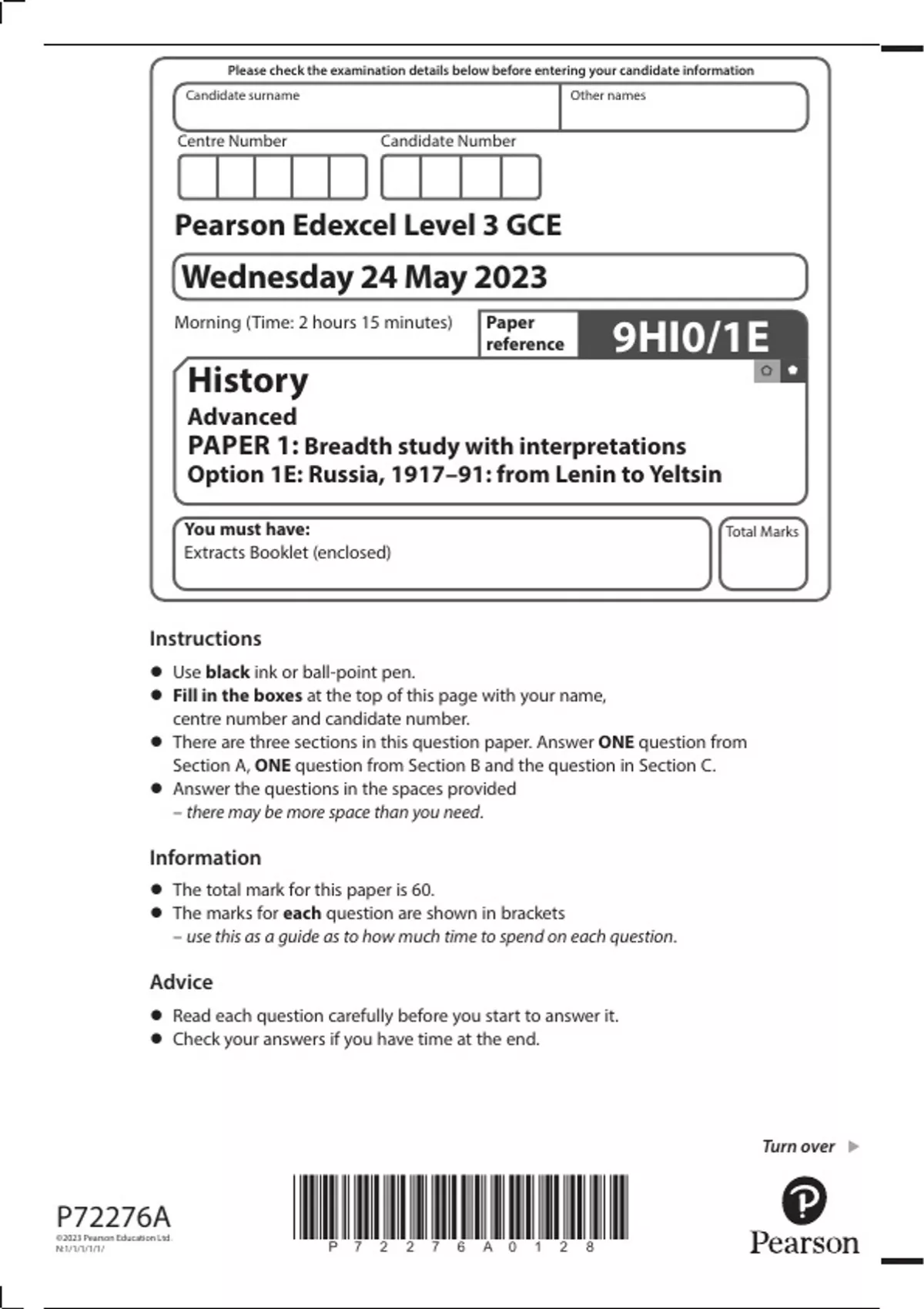 2023 Pearson Edexcel merged question and mark scheme History Advanced PAPER 1: Breadth study with interpretations Option 1E: Russia, 1917–91: from Lenin to Yeltsin
