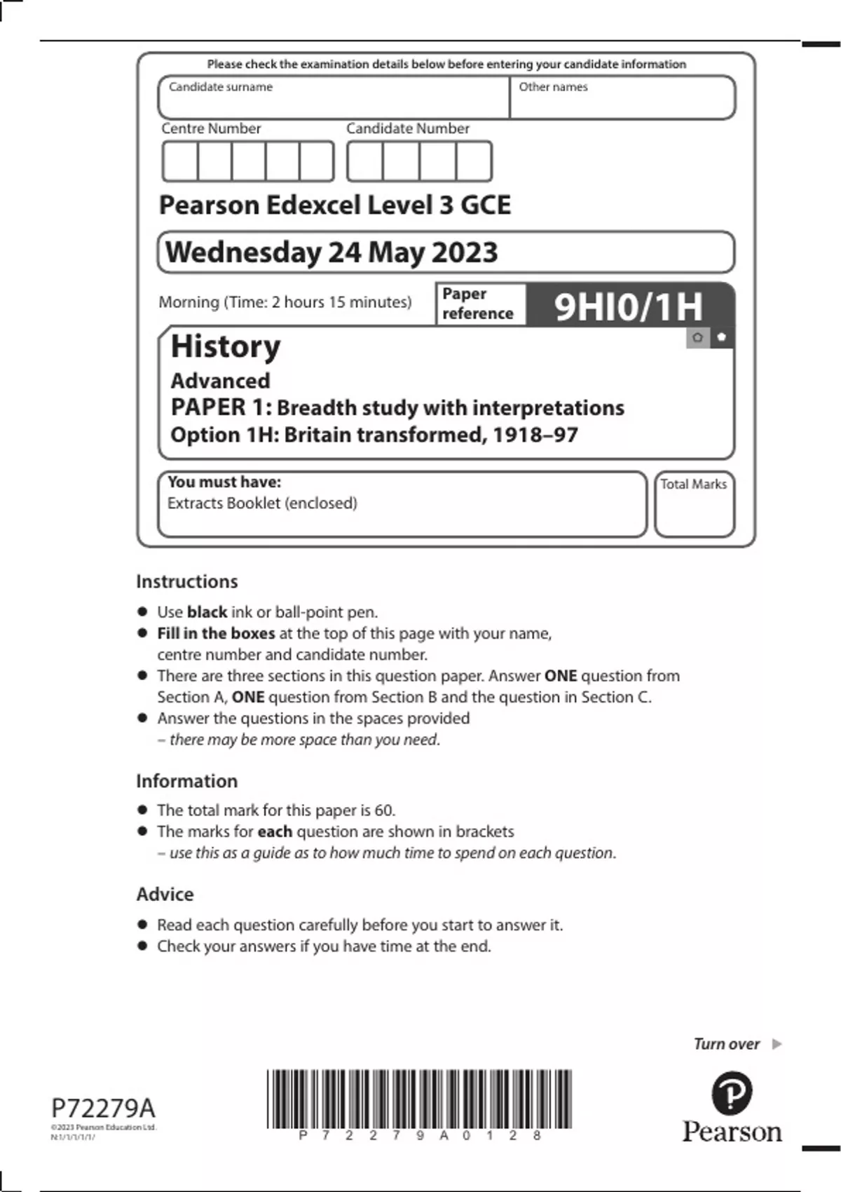 2023Pearson Edexcel merged question and mark scheme Level 3 GCE History Advanced PAPER 1: Breadth study with interpretations Option 1H: Britain transformed, 1918–97