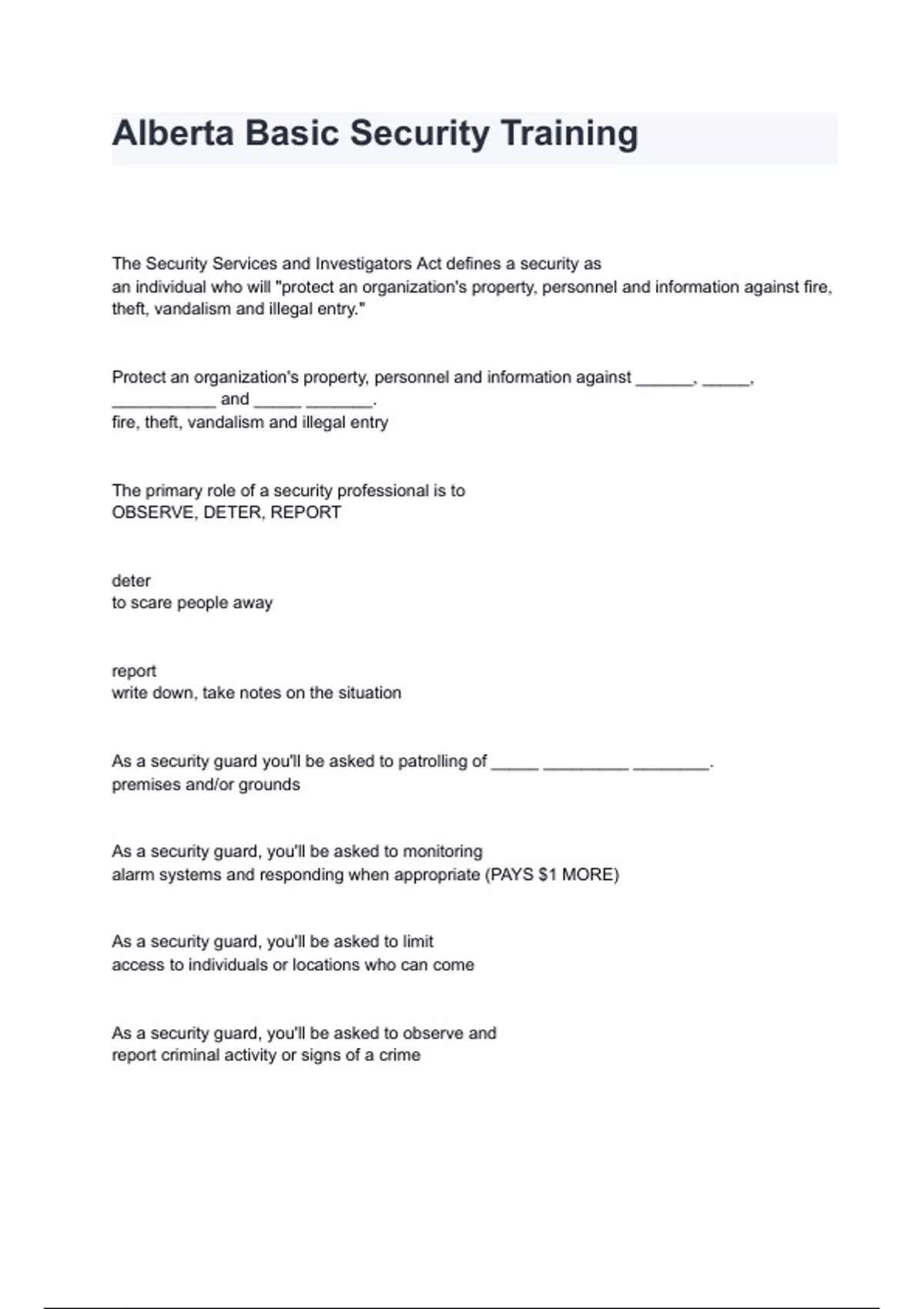 Alberta Basic Security Training Exam Questions And Answers The Security Services and Investigators Act defines a security as an individual who will "protect an organization's property, personnel and information against fire, theft, vandalism and illegal entry." Protect an organization's property, personnel and information against ______, _____, ___________ and _____ _______. fire, theft, vandalism and illegal entry The primary role of a security professional is to OBSERVE, DETER, REPORT deter to scare people away report write down, take notes on the situation As a security guard you'll be asked to patrolling of _____ _________ ________. premises and/or grounds As a security guard, you'll be asked to monitoring alarm systems and responding when appropriate (PAYS $1 MORE) As a security guard, you'll be asked to limit access to individuals or locations who can come As a security guard, you'll be asked to observe and report criminal activity or signs of a crime As a security guard, you'll be asked to direct traffic As a security guard, you'll be asked to respond to emergencies As a security guard, you'll be asked to document interactions and events As a security guard, you'll be asked to presenting a professional image As a security guard, you'll be asked to arresting those found committing a crime Protection of persons being responsible for the safety and well being of individuals Protection of persons include physically protecting such as serving as a bodyguard Protection of persons include physically protecting such as looking out for hazards when a group of people is present for example at a concert Protection of Property when you are responsible for protecting property against vandalism, theft, disturbances and fights and natural events like flooding or fire The Rights and Freedoms for all Canadians are set out in the 34 sections which form the Charter. Of particular instance to you, as a security professional, are the rights defined in ____ ___________ _____. 7 through 14 Canadian Charter of Rights and Freedoms