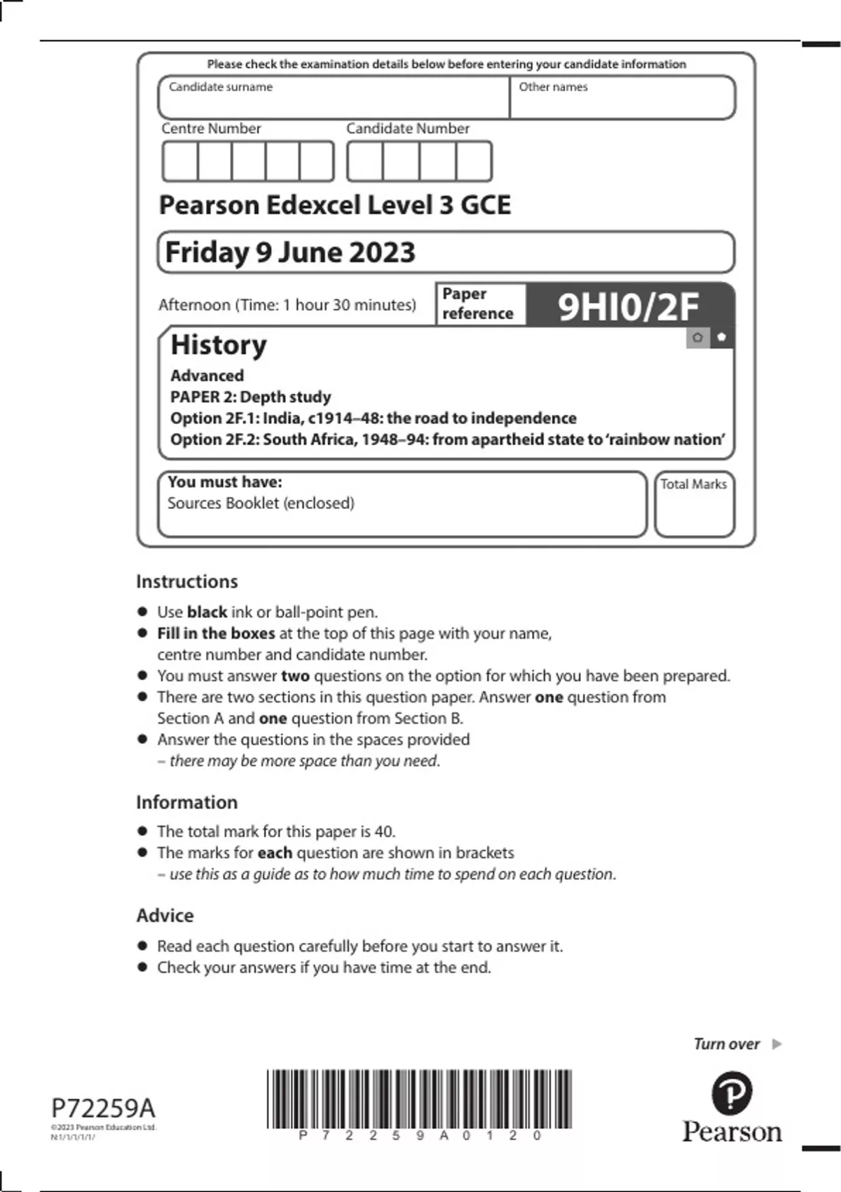 2023 pearson Edexcel merged question and mark scheme History Advanced PAPER 2: Depth study Option 2F.1: India, c1914–48: the road to independence Option 2F.2: South Africa, 1948–94: from apartheid state to ‘rainbow nation