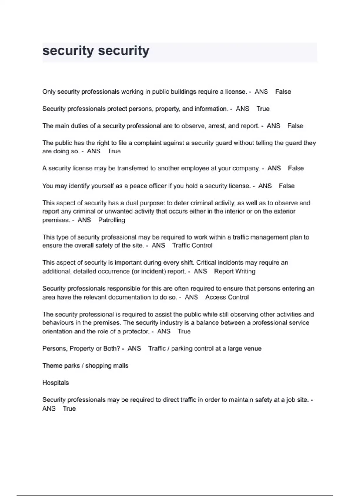 security security Exam Questions And Answers Only security professionals working in public buildings require a license. - ANS False Security professionals protect persons, property, and information. - ANS True The main duties of a security professional are to observe, arrest, and report. - ANS False The public has the right to file a complaint against a security guard without telling the guard they are doing so. - ANS True A security license may be transferred to another employee at your company. - ANS False You may identify yourself as a peace officer if you hold a security license. - ANS False This aspect of security has a dual purpose: to deter criminal activity, as well as to observe and report any criminal or unwanted activity that occurs either in the interior or on the exterior premises. - ANS Patrolling This type of security professional may be required to work within a traffic management plan to ensure the overall safety of the site. - ANS Traffic Control This aspect of security is important during every shift. Critical incidents may require an additional, detailed occurrence (or incident) report. - ANS Report Writing Security professionals responsible for this are often required to ensure that persons entering an area have the relevant documentation to do so. - ANS Access Control The security professional is required to assist the public while still observing other activities and behaviours in the premises. The security industry is a balance between a professional service orientation and the role of a protector. - ANS True Persons, Property or Both? - ANS Traffic / parking control at a large venue Theme parks / shopping malls