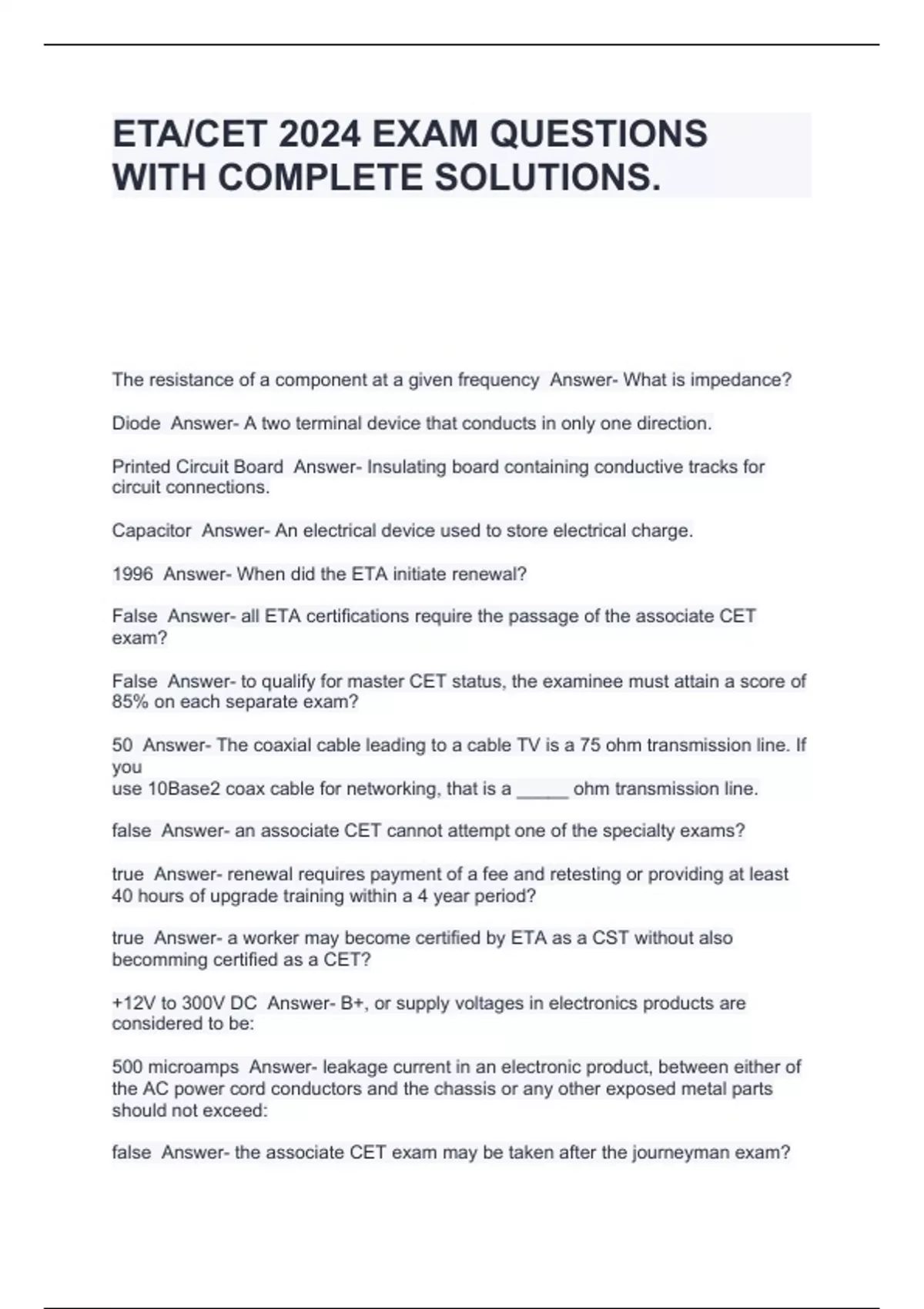 eta cet 2024 exam questions with complete solution