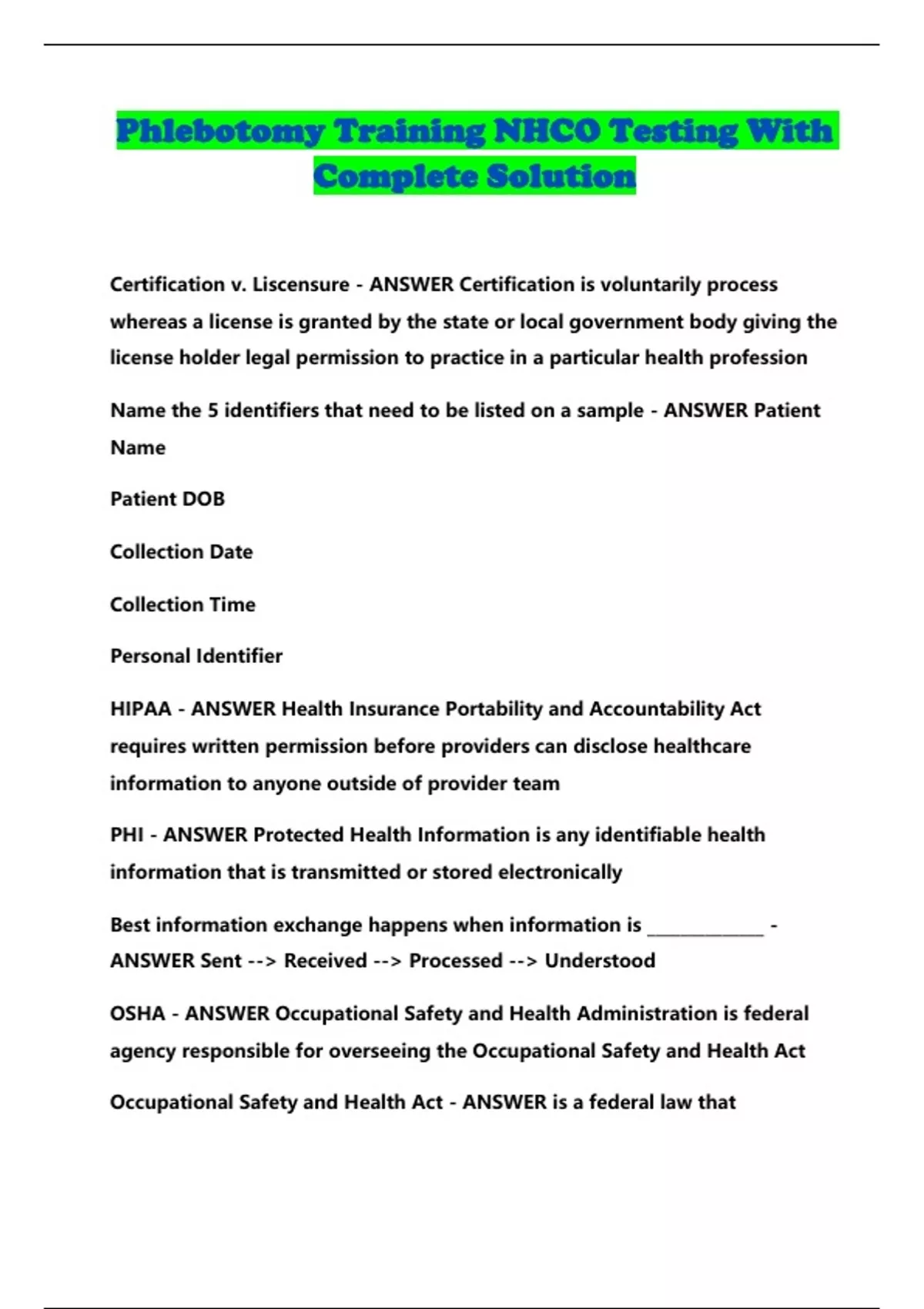 Phlebotomy Training NHCO Testing With Complete Solution...