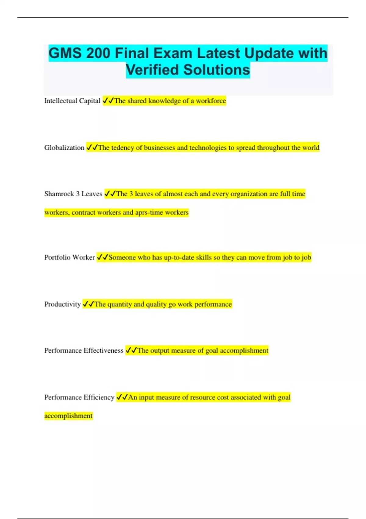 GMS 200 Final Exam Latest Update with Verified Solutions Intellectual Capital The shared knowledge of a workforce Globalization The tedency of businesses and technologies to spread throughout the world Shamrock 3 Leaves The 3 leaves of almost each and every organization are full time workers, contract workers and aprs-time workers Portfolio Worker Someone who has up-to-date skills so they can move from job to job Productivity The quantity and quality go work performance Performance Effectiveness The output measure of goal accomplishment Performance Efficiency An input measure of resource cost associated with goal accomplishment Sustainable Innovation When a business creates new products and production methods that have reduced environmental impacts Specific Environment Also called task environment, consists of the actual organizations, committees, groups and persons with whom a business interacts with and conducts business with Value Creation The creation for value for satisfying needs for stakeholders Strategic Positioning Helping an organization do same things as other business but in different ways Environmental Uncertainty A lack of information for the external environment of a business or an organization Manager A person who supports, activates and is responsible for the work of others Top Manager Guide the performance of the organization as a whole Middle Manager These are the managers who report to the top managers who are in charge of large divisions Line Manager Directly contribute to producing the organizations goods or services Staff Manager Use special technical expertise to advise and support line workers Functional Managers Are responsible for one area General Managers Are responsible for complex, multifunctional units Admins A manager in a public organization