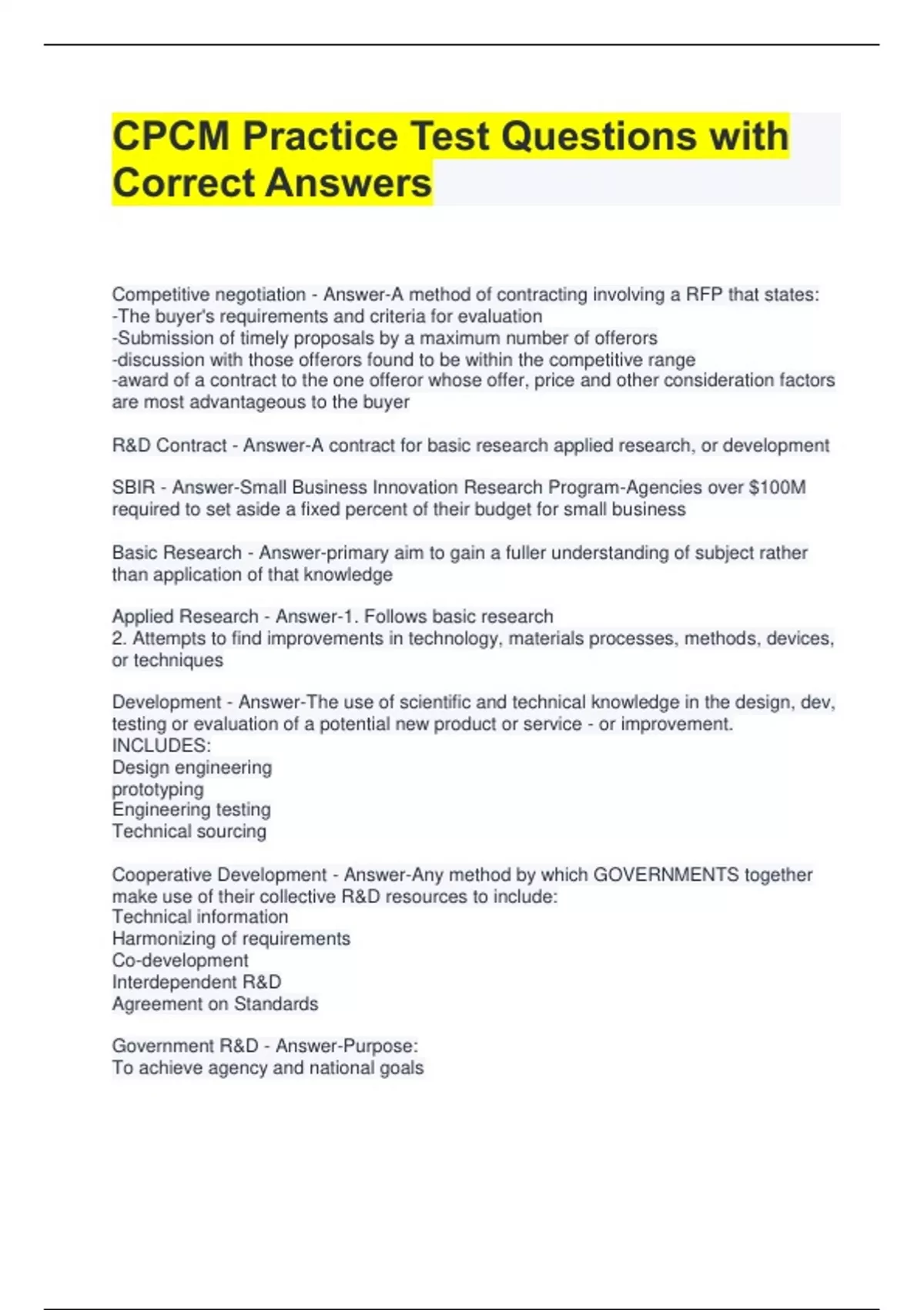 CPCM Practice Test Questions with Correct Answers Competitive negotiation - Answer-A method of contracting involving a RFP that states: -The buyer's requirements and criteria for evaluation -Submission of timely proposals by a maximum number of offerors -discussion with those offerors found to be within the competitive range -award of a contract to the one offeror whose offer, price and other consideration factors are most advantageous to the buyer R&D Contract - Answer-A contract for basic research applied research, or development SBIR - Answer-Small Business Innovation Research Program-Agencies over $100M required to set aside a fixed percent of their budget for small business Basic Research - Answer-primary aim to gain a fuller understanding of subject rather than application of that knowledge Applied Research - Answer-1. Follows basic research 2. Attempts to find improvements in technology, materials processes, methods, devices, or techniques Development - Answer-The use of scientific and technical knowledge in the design, dev, testing or evaluation of a potential new product or service - or improvement. INCLUDES: Design engineering prototyping Engineering testing Technical sourcing Cooperative Development - Answer-Any method by which GOVERNMENTS together make use of their collective R&D resources to include: Technical information Harmonizing of requirements Co-development Interdependent R&D Agreement on Standards Government R&D - Answer-Purpose: To achieve agency and national goals Commercial R&D - Answer-Future -oriented, long-term activities for profit Uniform Commercial Code (UCC) - Answer-Primary source of commercial contract Law -adopted as law by each state -Adopted by all but Louisiana -Governs the sale of any kind of goods -General Principles of contract law Statutory Law - Answer--Laws passed by legislation -Common Law-judge decision -May require some contracts to be in writing and executed using specific procedures Private Law - Answer-Includes the terms of the agreement between parties who have exchanged promises for consideration General principles of Contract Law (article 2 of the UCC) - Answer--Contract Formation -Seller/Buyer contractual obligations -contract performance Remedies for breach of contract Written contract - Answer-3 requirements -provide evidence of a contract for the sale of goods -signed by the party to be charged -specify a quantity -Contract for the sale of goods over$500 must be in writing to be enforceable Sarbanes-Oxley Act - Answer--Requirements to prevent companies from accounting for profits not realized in effort to portray value where none exists -Signed into law on July 30, 2002 Government Contract Law - Answer--Authority from the U.S. Constitution -Govt has the implied power to use contracts to fulfill its responsibiities Commercial Contract Law - Answer--States are primary source of law on commercial transactions -Statutory Law -Private Law Article 2 of the UCC - Answer-Current law governing contracts for the sale of goods between corporations Case Law - Answer-Legal principles derived from judicial decisions that are determined by applying statutory and regulatory requirements and interpreting the law as it applies to the case Common Law - Answer-a body of law common to the whole population, produced by the efforts of the judiciary to harmonize their decisions with precedent decisions and changes in law or regulation Contract Formation elements - Answer--Demonstration of mutual agreement through and offer and acceptance -consideration (something of value-money) -Legal purpose -capacity of the parties Contracts Interpretation - Answer--Course of performance -course of dealing -usage of trade Course of performance - Answer-Acts in the performance of the contract by either party that are not objected to. Consistent with the express terms Course of dealing - Answer-A series of previous conduct between the parties to a transaction that can be regarded as establishing a common basis of understanding for the terminology and conduct Usage of Trade - Answer-Practices or methods of dealing that are regularly observed and justify an expectation that they will apply to the transaction Acceptance - Answer-The act of an authorized buyer by which the buyer assents to ownership of existing and identified supplies or specific services rendered as partial or complete performance of a contract Offer - Answer-A legally binding promise, made by one party to another, to enter into a contractual agreement if accepted