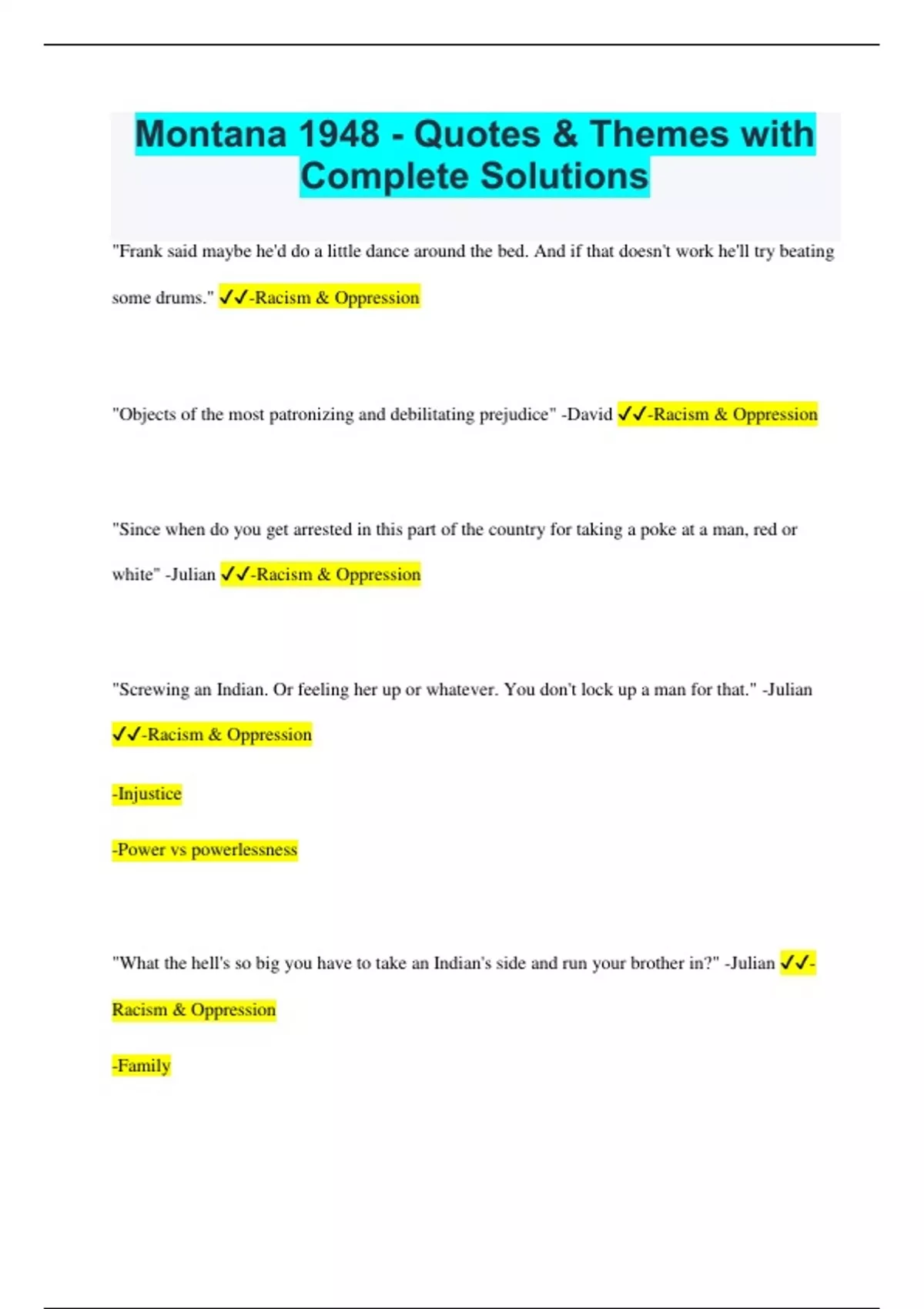 Racism & Oppression -Family "We want them white." -Julian ✔✔-Racism & Oppression "Frank's always been partial to red meat" -Julian ✔✔-Racism & Oppression -Injustice -Power vs powerlessness "I knew without being told, as if it were knowledge that I drank in with the water, that college was not for Indians" ✔✔-Racism & Oppression "good enough for the Army but not for college" ✔✔-Racism & Oppression "Marie's room, when she stayed with us duri ng the week, was a small room off the kitchen" ✔✔-