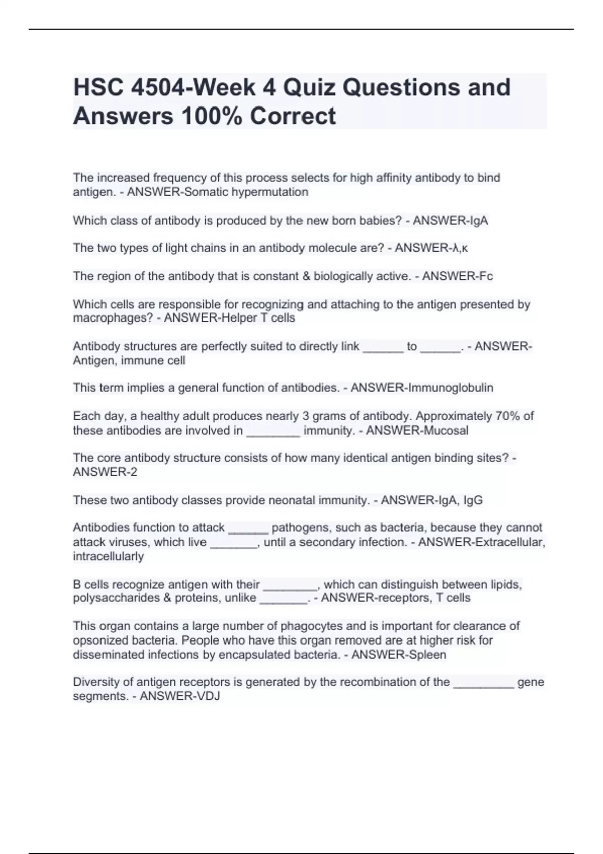 HSC 4504-Week 4 Quiz Questions and Answers 100% CorrectHSC 4504-Week 4 Quiz Questions and Answers 100% CorrectHSC 4504-Week 4 Quiz Questions and Answers 100% CorrectHSC 4504-Week 4 Quiz Questions and Answers 100% Correct The increased frequency of this process selects for high affinity antibody to bind antigen. - ANSWER-Somatic hypermutation