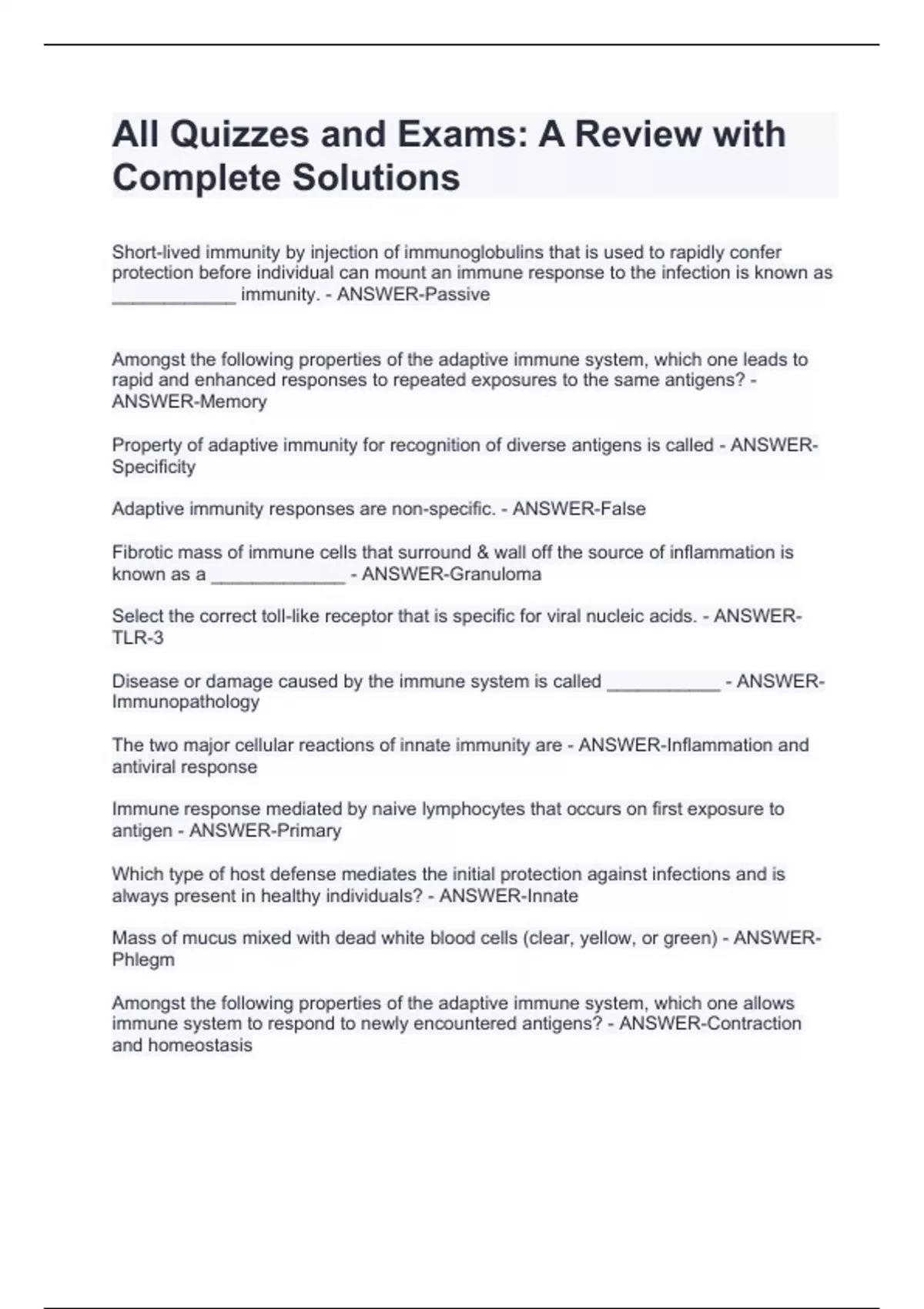 HSC4504 All Quizzes and Exams: A Review with Complete SolutionsHSC4504 All Quizzes and Exams: A Review with Complete SolutionsHSC4504 All Quizzes and Exams: A Review with Complete SolutionsHSC4504 All Quizzes and Exams: A Review with Complete SolutionsShort-lived immunity by injection of immunoglobulins that is used to rapidly confer protection before individual can mount an immune response to the infection is known as ____________ immunity. - ANSWER-Passive Amongst the following properties of the adaptive immune system, which one leads to rapid and enhanced responses to repeated exposures to the same antigens? - ANSWER-Memory Property of adaptive immunity for recognition of diverse antigens is called - ANSWER-Specificity Adaptive immunity responses are non-specific. - ANSWER-False Fibrotic mass of immune cells that surround & wall off the source of inflammation is known as a _____________ - ANSWER-Granuloma
