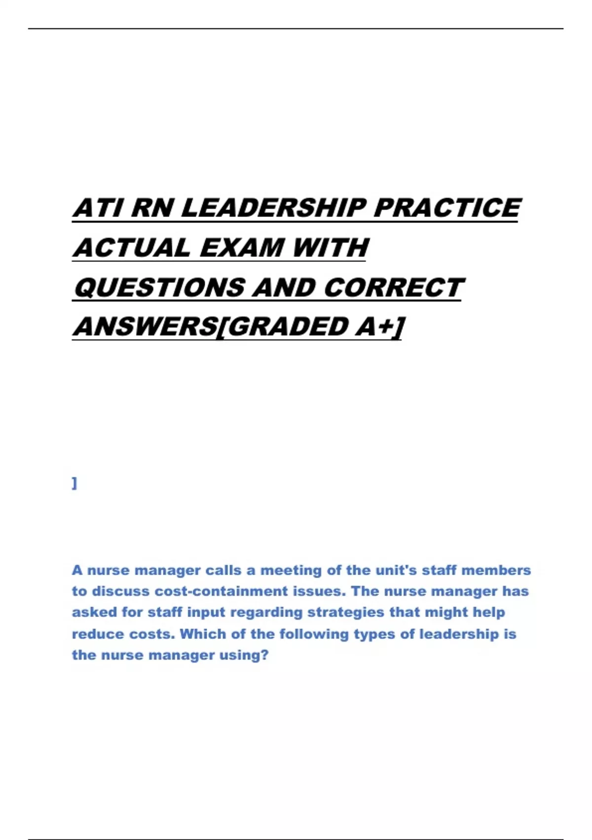 ATI RN LEADERSHIP PRACTICE ACTUAL EXAM WITH QUESTIONS AND CORRECT ANSWERS[GRADED A+] ] A nurse manager calls a meeting of the unit's staff members to discuss cost-containment issues. The nurse manager has asked for staff input regarding strategies that might help reduce costs. Which of the following types of leadership is the nurse manager using? a. Autocratic b. Democratic c. Laissez-faire d. Moral - CORRECT ANSWER-Democratic A democratic leader guides staff toward reaching an objective and shares responsibility with the staff. this is the ideal type of leadership in this situation because a great amount of creativity can occur and many strategies can be developed. Makes decisions independently and then notifies staff of the decisions made. Maintains a high degree of control over the staff and allows little freedom of staff members - CORRECT ANSWER-Autocratic Guides staff toward reaching an objective and shares responsibility with the staff. This is an ideal type of leadership because a great amount of creativity can occur and many strategies can be developed - CORRECT ANSWERDemocratic A home health nurse is caring for a client who asks what is included in a living will. Which of the following statements should the nurse include in the teaching? a. It establishes who will make health care decisions if the client is not able b. It allows the client to express personal wishes regarding health care decisions c. It serves as an informed consent for procedures - CORRECT ANSWER-b. It allows the client to express personal wishes regarding health care decisions Using quality monitoring tools, a faci