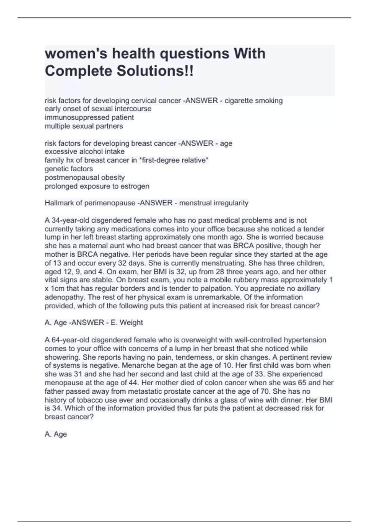 A. Age -ANSWER - E. Weight A 64-year-old cisgendered female who is overweight with well-controlled hypertension comes to your office with concerns of a lump in her breast that she noticed while showering. She reports having no pain, tenderness, or skin changes. A pertinent review of systems is negative. Menarche began at the age of 10. Her first child was born when she was 31 and she had her second and last child at the age of 33. She experienced menopause at the age of 44. Her mother died of colon cancer when she was 65 and her father passed away from metastatic prostate cancer at the age of 70. She has no history of tobacco use ever and occasionally drinks a glass of wine with dinner. Her BMI is 34. Which of the information provided thus far puts the patient at decreased risk for breast cancer? A. Age B. Age at first birth C. Age at menarche D. Age at menopause E. Weight -ANSWER - D. Age at menopause A 63-year old cisgendered female comes into your office for her annual preventive exam. She has hypertension and type 2 diabetes. She is not sexually active. Her blood pressure is 125/80 and her physical exam otherwise is within normal limits. You recommend influenza and zoster vaccination. Her last colonoscopy was eight years ago and her last mammogram one year ago; both were normal. She has never had an abnormal Pap test. At the age of 45 she had a total hysterectomy for fibroids. Of the details provided about this patient, which is an appropriate reason to explain why she does not need a Pap test today? A. She experienced menopause more than 10 years ago B. She had a total hysterectomy for fibroids C. She has never had an abnormal pap test D. She is 63 years old E. She is not sexually active -ANSWER - B. She had a total hysterectomy for fibroids