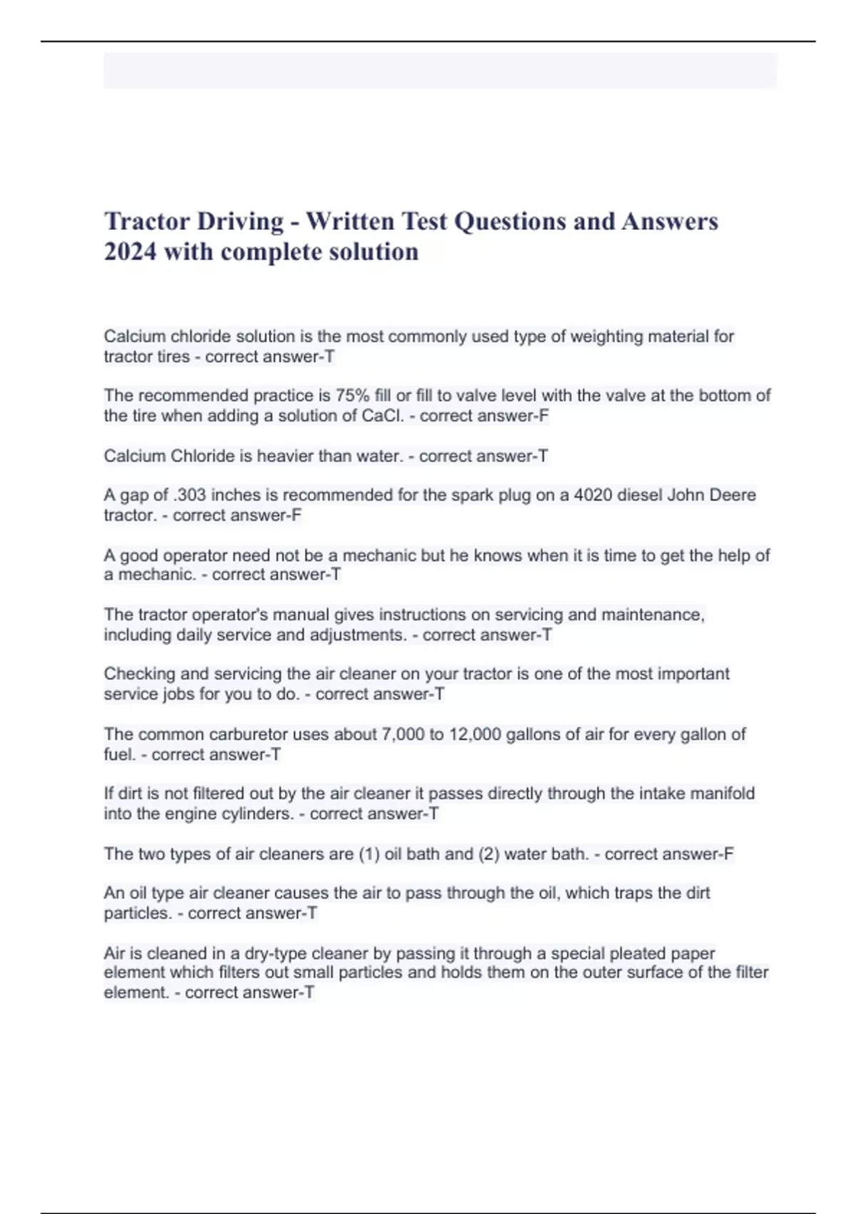 Tractor Driving - Written Test Questions and Answers 2024 with complete solution