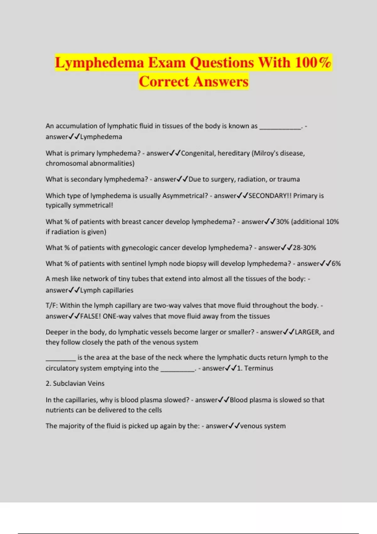 Lymphedema Exam Questions With 100% Correct Answers An accumulation of lymphatic fluid in tissues of the body is known as ___________. - answerLymphedema What is primary lymphedema? - answerCongenital, hereditary (Milroy's disease, chromosomal abnormalities) What is secondary lymphedema? - answerDue to surgery, radiation, or trauma Which type of lymphedema is usually Asymmetrical? - answerSECONDARY!! Primary is typically symmetrical! What % of patients with breast cancer develop lymphedema? - answer30% (additional 10% if radiation is given) What % of patients with gynecologic cancer develop lymphedema? - answer28-30% What % of patients with sentinel lymph node biopsy will develop lymphedema? - answer6% A mesh like network of tiny tubes that extend into almost all the tissues of the body: - answerLymph capillaries T/F: Within the lymph capillary are two-way valves that move fluid throughout the body. - answerFALSE! ONE-way valves that move fluid away from the tissues Deeper in the body, do lymphatic vessels become larger or smaller? - answerLARGER, and they follow closely the path of the venous system ________ is the area at the base of the neck where the lymphatic ducts return lymph to the circulatory system emptying into the _________. - answer1. Terminus 2. Subclavian Veins In the capillaries, why is blood plasma slowed? - answerBlood plasma is slowed so that nutrients can be delivered to the cells The majority of the fluid is picked up again by the: - answervenous system How much of the fluid is carried away by the lymphatic system? - answerApproximately 10% - Finger like projections in the tissue that pick up the 10% of fluid left by the veins Where does the thoracic duct extend from? - answerIt extends from L2 to the root of the neck on the left side . The thoracic duct collects lymphatic fluid from all parts of the body except: - answerThe right side of the head/neck and right upper quadrant of the trunk and right UE. Explain the path of the lymphatic system on the Right. - answerDrains into the right side of the neck with fluid from the right side of the head and neck, right arm and upper right quadrant of the body What lies anteriorly over L2 and is the beginning of the thoracic duct? - answerCisterna Chyli The Cisterna Chyli temporarily stores the fluid prior to: - answerthe fluid moving into the thoracic duct Thoracic duct enters the thorax thru the diaphragm at the: - answeraortic hiatus Which thoracic duct is responsible for the majority of the body's drainage? - answerLEFT much more compared to the right What can help keep liquid moving throughout the lymphatic system? - answerDeep breathing because the lymphatic system is dependent on pressure change. T/F: The Transport Capacity of the lymphatic system is well above what is needed on a regular basis. - answerTRUE! What is the amount of lymphatic fluid that the lymphatic system is being asked to transport? - answerLymphatic load How can the ability to move fluid be disrupted? (can cause increased amount of fluid left in the tissue) - answerDamage to lymphatic tissues or removal of lymph nodes If the veins aren't functioning well and leaving more than 10%, what might happen to lymphatic system? - answerIt will have to work harder and over time can break down and lymphatic system insufficiency can develop If lymphatic load is increased but below the capacity of the lymph system to transport, how much swelling might be noted? - answerNONE; swelling is seen if the lymphatic load exceeds the threshold of the transport capa