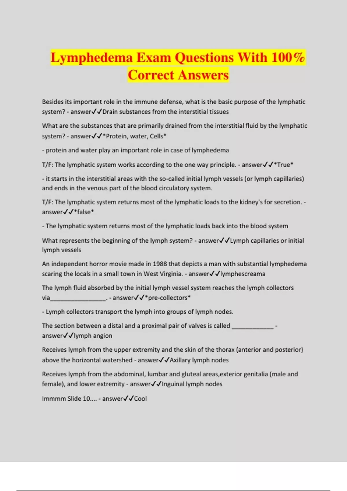 Lymphedema Exam Questions With 100% Correct Answers Besides its important role in the immune defense, what is the basic purpose of the lymphatic system? - answerDrain substances from the interstitial tissues What are the substances that are primarily drained from the interstitial fluid by the lymphatic system? - answer*Protein, water, Cells* - protein and water play an important role in case of lymphedema T/F: The lymphatic system works according to the one way principle. - answer*True* - it starts in the interstitial areas with the so-called initial lymph vessels (or lymph capillaries) and ends in the venous part of the blood circulatory system. T/F: The lymphatic system returns most of the lymphatic loads to the kidney's for secretion. - answer*false* - The lymphatic system returns most of the lymphatic loads back into the blood system What represents the beginning of the lymph system? - answerLymph capillaries or initial lymph vessels An independent horror movie made in 1988 that depicts a man with substantial lymphedema scaring the locals in a small town in West Virginia. - answerlymphescreama The lymph fluid absorbed by the initial lymph vessel system reaches the lymph collectors via________________. - answer*pre-collectors* - Lymph collectors transport the lymph into groups of lymph nodes. The section between a distal and a proximal pair of valves is called ____________ - answerlymph angion Receives lymph from the upper extremity and the skin of the thorax (anterior and posterior) above the horizontal watershed - answerAxillary lymph nodes Receives lymph from the abdominal, lumbar and gluteal areas,exterior genitalia (male and female), and lower extremity - answerInguinal lymph nodes Immmm Slide 10.... - answerCool