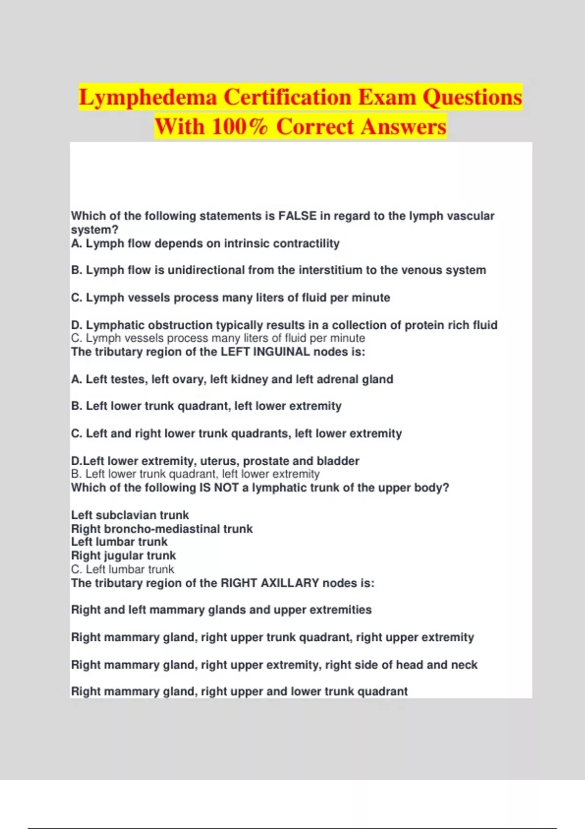 Lymphedema Certification Exam Questions With 100% Correct Answers Which of the following statements is FALSE in regard to the lymph vascular system? A. Lymph flow depends on intrinsic contractility B. Lymph flow is unidirectional from the interstitium to the venous system C. Lymph vessels process many liters of fluid per minute D. Lymphatic obstruction typically results in a collection of protein rich fluid C. Lymph vessels process many liters of fluid per minute The tributary region of the LEFT INGUINAL nodes is: A. Left testes, left ovary, left kidney and left adrenal gland B. Left lower trunk quadrant, left lower extremity C. Left and right lower trunk quadrants, left lower extremity D.Left lower extremity, uterus, prostate and bladder B. Left lower trunk quadrant, left lower extremity Which of the following IS NOT a lymphatic trunk of the upper body? Left subclavian trunk Right broncho-mediastinal trunk Left lumbar trunk Right jugular trunk C. Left lumbar trunk The tributary region of the RIGHT AXILLARY nodes is: Right and left mammary glands and upper extremities Right mammary gland, right upper trunk quadrant, right upper extremity Right mammary gland, right upper extremity, right side of head and neck Right mammary gland, right upper and lower trunk quadrant B. Right mammary gland, right upper trunk quadrant, right upper extremity Which of the following is true about the thoracic duct? It is the largest lymphatic vessel in the human body It enters into the left venous angle All are true It starts at the cisterna chyli C. All are true It is the largest lymphatic vessel in the human body, enters into the left venous angle, and starts at the cisterna chyli. The functions of the lymphatic system include all of the following EXCEPT? Produce and store lymphocytes Absorb nutritional fatty acids from the intestines Return deoxygenated blood to the heart Absorb interstitial fluid and return it to the venous circulation C. Return deoxygenated blood to the heart (The superior and inferior vena cava are collectively called the venae cavae. The venae cavae, along with the aorta, are the great vessels involved in systemic circulation. These veins return deoxygenated blood from the body into the heart, emptying it into the right atrium.) Which of the following IS NOT a characteristic of lymph collectors? A three layer muscular wall Lymphangia Anchoring filaments Intrinsic contractility C. Anchoring filaments Which of the following lymphatic watersheds (WS) exist on both the anterior and posterior aspects of the body? Chaps Watershed Median-sagittal Watershed Spine of scapula Watershed Clavicle Watershed B. Median-sagittal Watershed Which of the following is true about the intestinal lymphatic system? Intestinal lymph is called chyle The intestinal lymph sometimes appears white after a high protein meal The intestinal lymph is unable to carry proteins Water soluble vitamins are absorbed into the intestinal lymphatic system A. Intestinal lymph is called chyle Which of the following statements regarding lymph and blood capillaries is true? Lymph capillaries have a smaller diameter than blood capillaries Blood capillaries have anchoring filaments and lymph capillaries do not A lack of a basement membrane in blood capillaries allows absorption of large protein molecules "Swinging flaps" of lymph capillaries allow absorption of large protein molecules D. "Swinging flaps" of lymph capillaries allow absorption of large protein molecules Which of the following statements about lymph collectors is FALSE? Collectors connect with each other via anastamoses Deep collectors typically run along with arteries and veins Superficial collectors drain muscles, joints and ligaments Perforating vessels connect superficial to deep collectors through the muscle fascia C. Superficial collectors drain muscles, joints and ligaments Lymph fluid consists of which of the following? Proteins, red blood cells, lymphocytes, bile Proteins, water, insulin, white blood cells Fatty acids, cells, water, protein molecules Waste products, water, cholesterol, glucose C. Fatty acids, cells, water, protein molecules The thoracic duct drains all of the following EXCEPT? The intestines, genitourinary organs, and liver The right arm and right trunk quadrant The right leg, left arm, and left side of the head and neck The left leg, both lower trunk quadrants, and both kidneys B. The right arm and right trunk quadrant Which of the following statement about the lymph nodes is TRUE? The majority of lymph nodes are found in the extremities Lymph nodes have more efferent than afferent lymph vessels There are 600-700 lymph nodes in the human body Lymph nodes are always palpable C. There are 600-700 lymph nodes in the human body Which lymph vessel DOES NOT contain valves? Lymph collectors of the upper medial arm Pre-collectors of the gluteal region The abdominal thoracic duct Lymph capillaries of the dorsum of the hand D. Lymph capillaries of the dorsum of the hand What is the main task of the lymph capillaries? To ensure proper oxygenation of tissue To return blood from the interstitium to the heart To transport lymph through muscular valves towards lymph nodes To ensure the absorption of proteins and fluid from the interstitial spaces D. To ensure the absorption of proteins and fluid from the interstitial spaces What structures make up the "venous angle"? Internal jugular and subclavian veins External and internal jugular veins Both internal jugular veins Internal jugular and cephalic veins A. Internal jugular and subclavian veins The lymphatic organs of the body are: