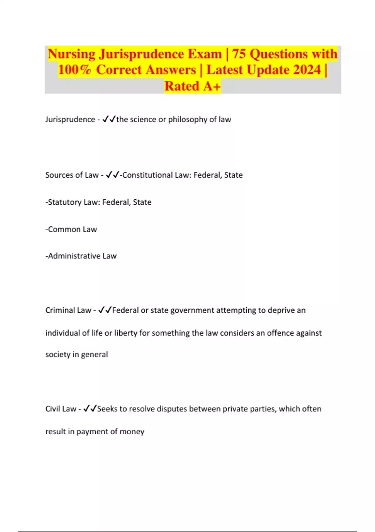 Nursing Jurisprudence Exam | 75 Questions with 100% Correct Answers | Latest Update 2024 | Rated A+