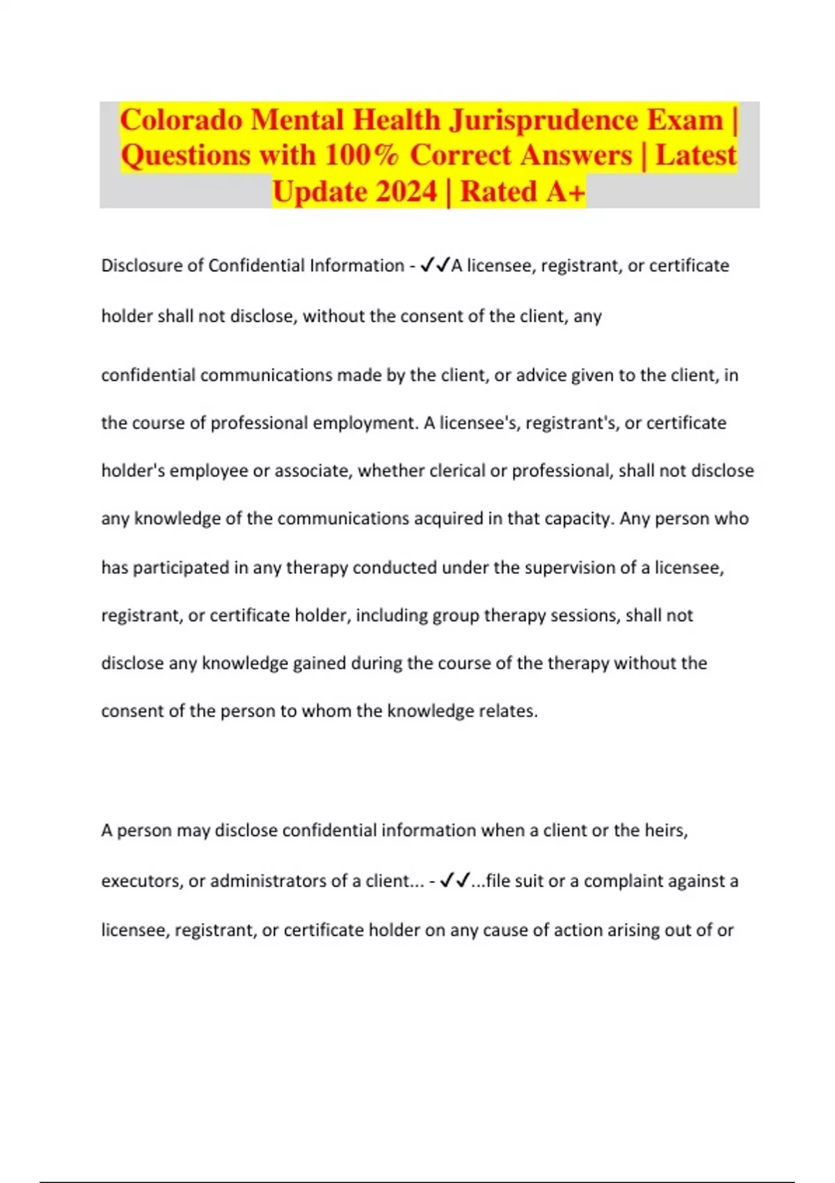 Colorado Mental Health Jurisprudence Exam | Questions with 100% Correct Answers | Latest Update 2024 | Rated A+