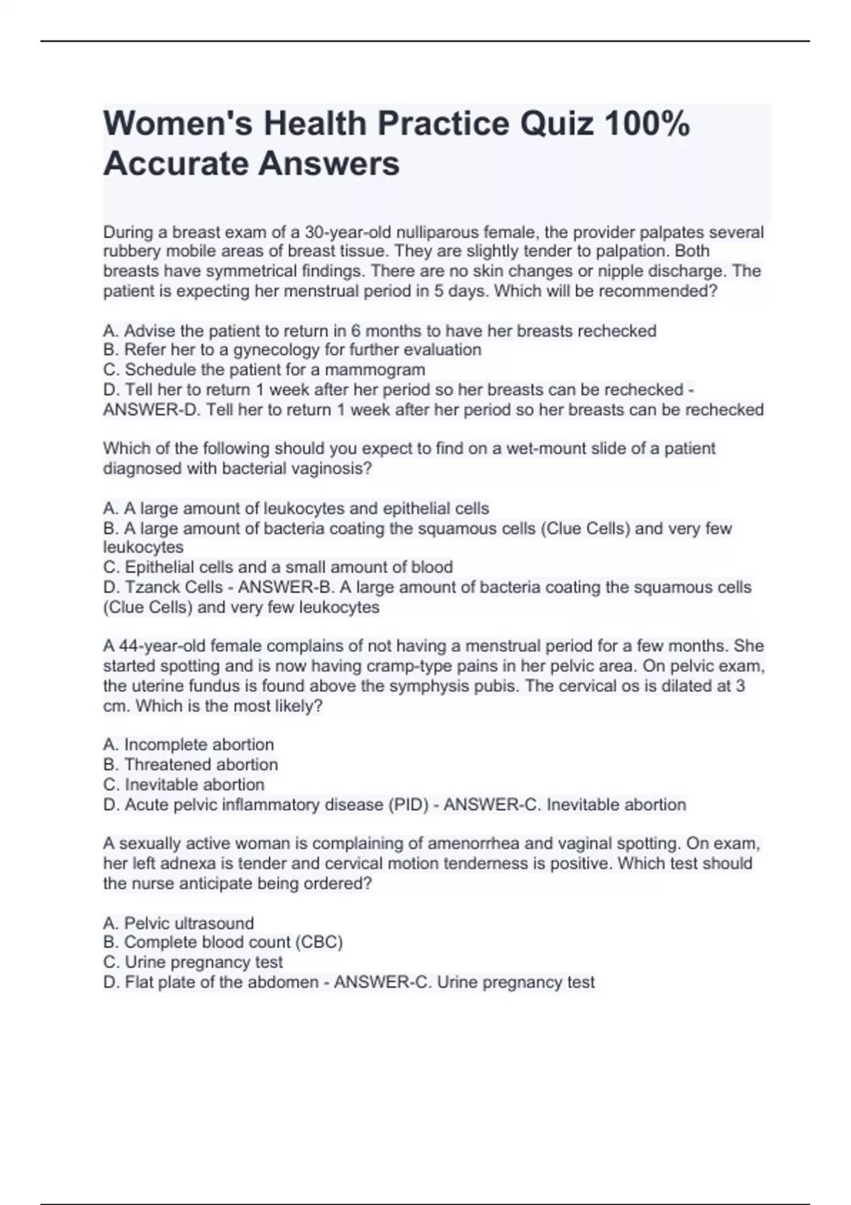 A. Advise the patient to return in 6 months to have her breasts rechecked B. Refer her to a gynecology for further evaluation C. Schedule the patient for a mammogram D. Tell her to return 1 week after her period so her breasts can be rechecked - ANSWER-D. Tell her to return 1 week after her period so her breasts can be rechecked Which of the following should you expect to find on a wet-mount slide of a patient diagnosed with bacterial vaginosis? A. A large amount of leukocytes and epithelial cells B. A large amount of bacteria coating the squamous cells (Clue Cells) and very few leukocytes C. Epithelial cells and a small amount of blood D. Tzanck Cells - ANSWER-B. A large amount of bacteria coating the squamous cells (Clue Cells) and very few leukocytes A 44-year-old female complains of not having a menstrual period for a few months. She started spotting and is now having cramp-type pains in her pelvic area. On pelvic exam, the uterine fundus is found above the symphysis pubis. The cervical os is dilated at 3 cm. Which is the most likely? A. Incomplete abortion B. Threatened abortion C. Inevitable abortion D. Acute pelvic inflammatory disease (PID) - ANSWER-C. Inevitable abortion A sexually active woman is complaining of amenorrhea and vaginal spotting. On exam, her left adnexa is tender and cervical motion tenderness is positive. Which test should the nurse anticipate being ordered? A. Pelvic ultrasound B. Complete blood count (CBC) C. Urine pregnancy test D. Flat plate of the abdomen - ANSWER-C. Urine pregnancy test