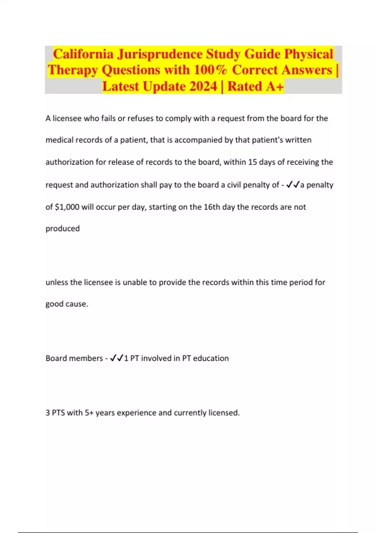 California Jurisprudence Study Guide Physical Therapy Questions with 100% Correct Answers | Latest Update 2024 | Rated A+