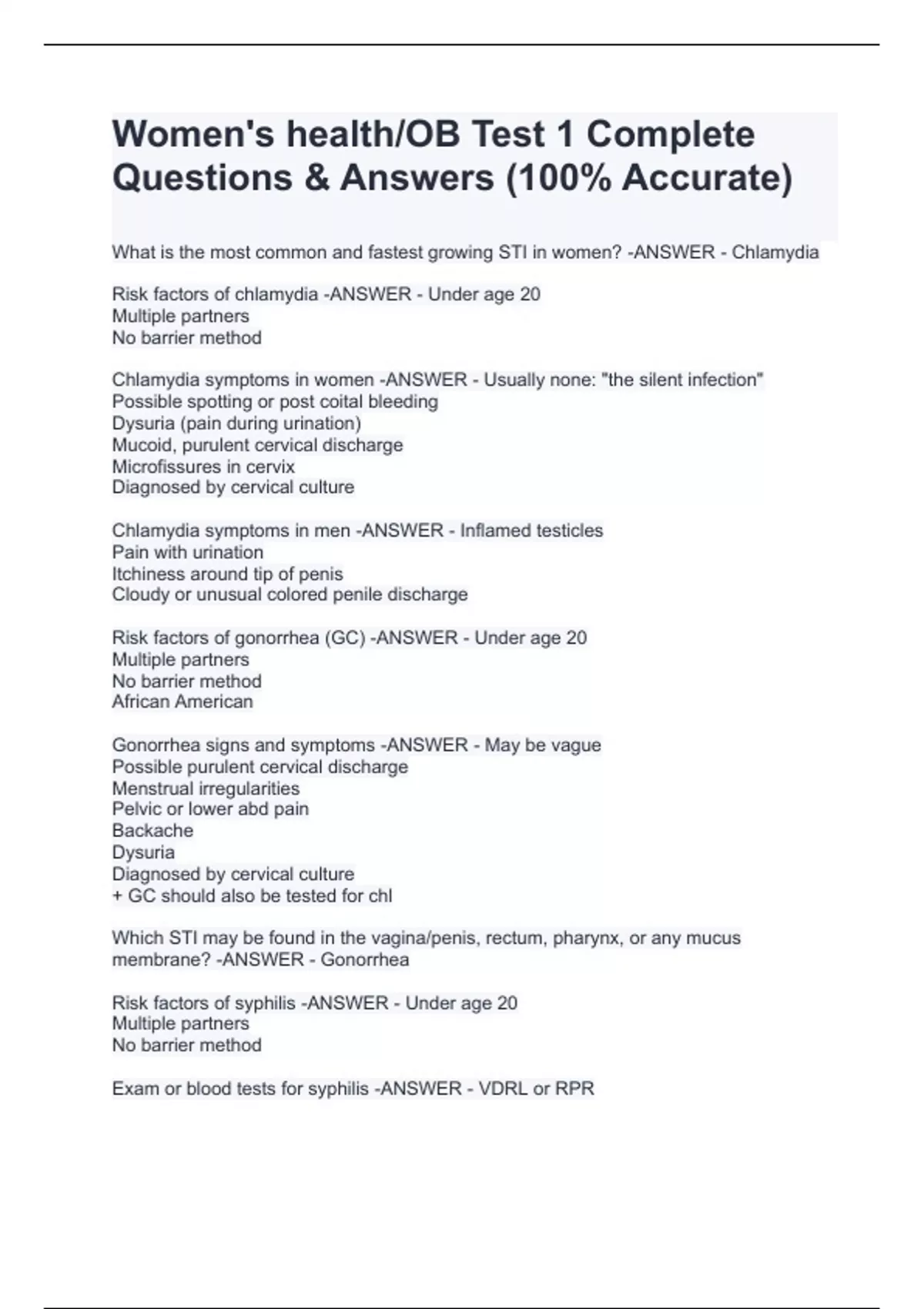 Chlamydia symptoms in women -ANSWER - Usually none: "the silent infection" Possible spotting or post coital bleeding Dysuria (pain during urination) Mucoid, purulent cervical discharge Microfissures in cervix Diagnosed by cervical culture Chlamydia symptoms in men -ANSWER - Inflamed testicles Pain with urination Itchiness around tip of penis Cloudy or unusual colored penile discharge Risk factors of gonorrhea (GC) -ANSWER - Under age 20 Multiple partners No barrier method African American Gonorrhea signs and symptoms -ANSWER - May be vague Possible purulent cervical discharge Menstrual irregularities Pelvic or lower abd pain Backache Dysuria Diagnosed by cervical culture + GC should also be tested for chl Which STI may be found in the vagina/penis, rectum, pharynx, or any mucus membrane? -ANSWER - Gonorrhea Risk factors of syphilis -ANSWER - Under age 20 Multiple partners No barrier method Exam or blood tests for syphilis -ANSWER - VDRL or RPR