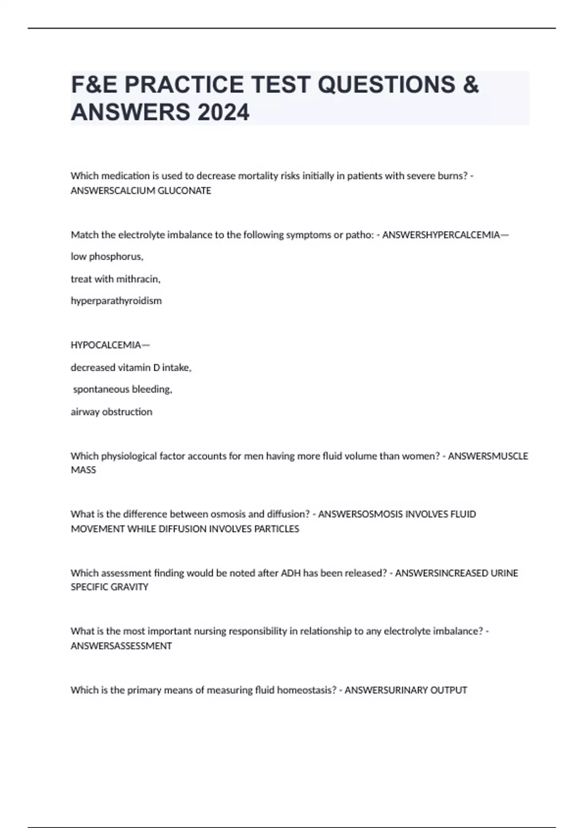 F&E PRACTICE TEST QUESTIONS & ANSWERS 2024 Which medication is used to decrease mortality risks initially in patients with severe burns? - ANSWERSCALCIUM GLUCONATE Match the electrolyte imbalance to the following symptoms or patho: - ANSWERSHYPERCALCEMIA— low phosphorus, treat with mithracin, hyperparathyroidism HYPOCALCEMIA— decreased vitamin D intake, spontaneous bleeding, airway obstruction Which physiological factor accounts for men having more fluid volume than women? - ANSWERSMUSCLE MASS What is the difference between osmosis and diffusion? - ANSWERSOSMOSIS INVOLVES FLUID MOVEMENT WHILE DIFFUSION INVOLVES PARTICLES Which assessment finding would be noted after ADH has been released? - ANSWERSINCREASED URINE SPECIFIC GRAVITY What is the most important nursing responsibility in relationship to any electrolyte imbalance? - ANSWERSASSESSMENT Which is the primary means of measuring fluid homeostasis? - ANSWERSURINARY OUTPUT