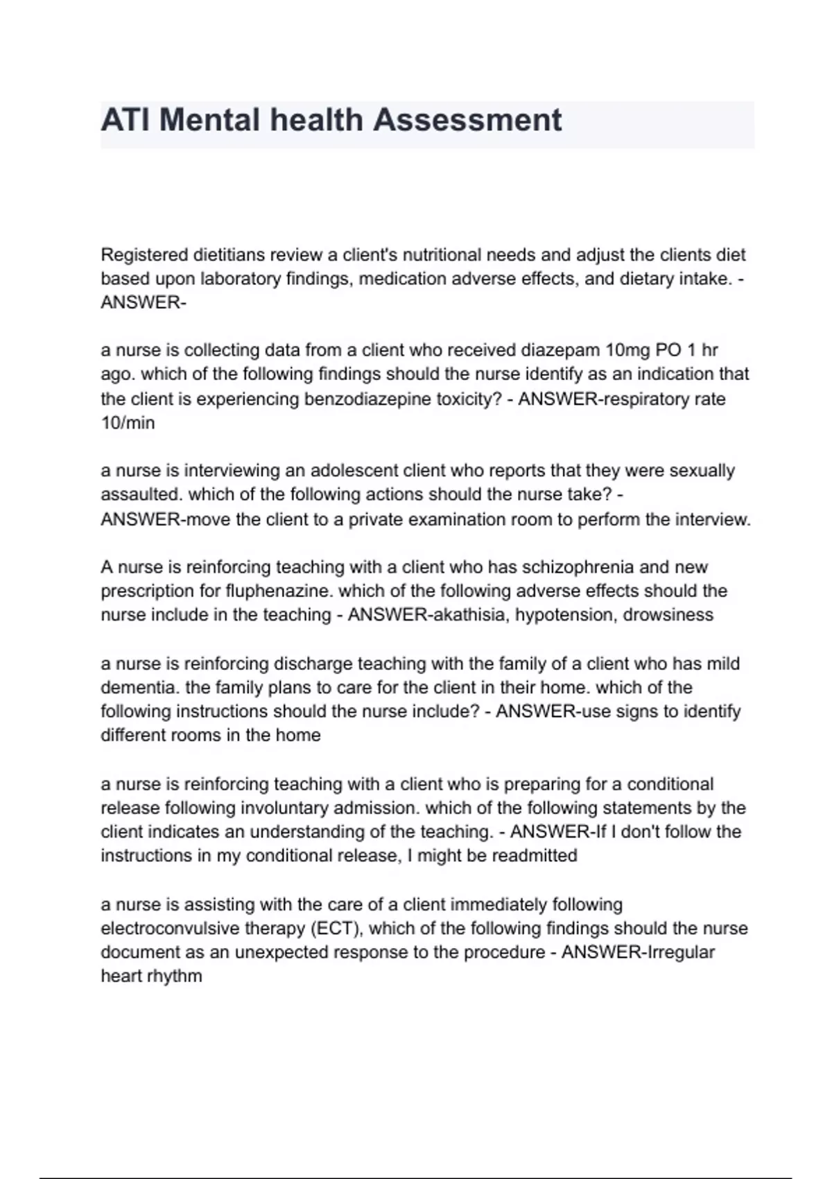 ATI Mental health Assessment Registered dietitians review a client's nutritional needs and adjust the clients diet based upon laboratory findings, medication adverse effects, and dietary intake. - ANSWERa nurse is collecting data from a client who received diazepam 10mg PO 1 hr ago. which of the following findings should the nurse identify as an indication that the client is experiencing benzodiazepine toxicity? - ANSWER-respiratory rate 10/min a nurse is interviewing an adolescent client who reports that they were sexually assaulted. which of the following actions should the nurse take? - ANSWER-move the client to a private examination room to perform the interview. A nurse is reinforcing teaching with a client who has schizophrenia and new prescription for fluphenazine. which of the following adverse effects should the nurse include in the t
