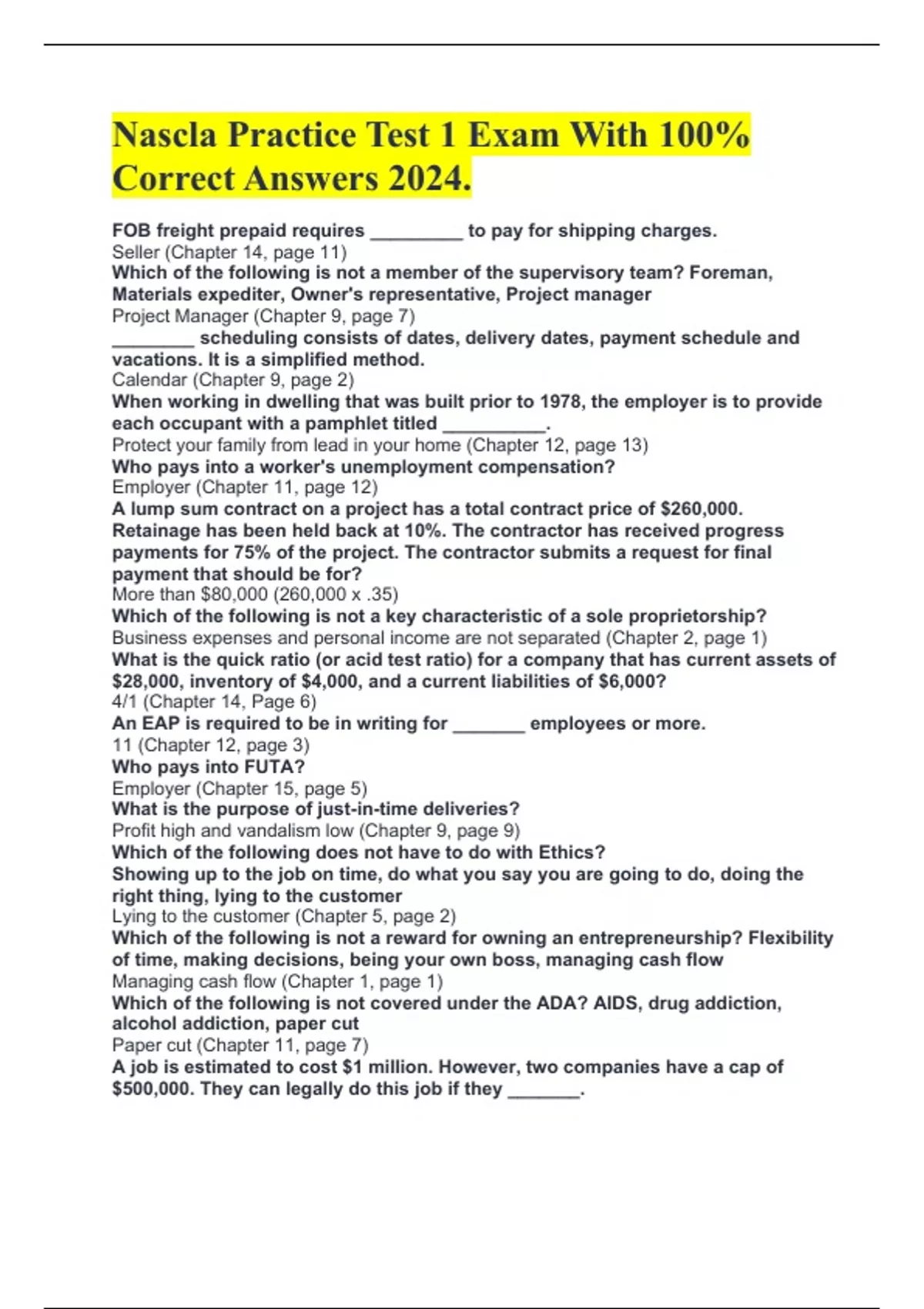 Nascla Practice Test 1 Exam With 100% Correct Answers 2024. FOB freight prepaid requires _________ to pay for shipping charges. Seller (Chapter 14, page 11) Which of the following is not a member of the supervisory team? Foreman, Materials expediter, Owner's representative, Project manager Project Manager (Chapter 9, page 7) ________ scheduling consists of dates, delivery dates, payment schedule and vacations. It is a simplified method. Calendar (Chapter 9, page 2) When working in dwelling that was built prior to 1978, the employer is to provide each occupant with a pamphlet titled __________. Protect your family from lead in your home (Chapter 12, page 13) Who pays into a worker's unemployment compensation? Employer (Chapter 11, page 12) A lump sum contract on a project has a total contract price of $260,000. Retainage has been held back at 10%. The contractor has received progress payments for 75% of the project. The contractor submits a request for final payment that should be for? More than $80,000 (260,000 x .35) Which of the following is not a key characteristic of a sole proprietorship? Business expenses and personal income are not separated (Chapter 2, page 1) What is the quick ratio (or acid test ratio) for a company that has current assets of $28,000, inventory of $4,000, and a current liabilities of $6,000? 4/1 (Chapter 14, Page 6) An EAP is required to be in writing for _______ employees or more. 11 (Chapter 12, page 3) Who pays into FUTA? Employer (Chapter 15, page 5) What is the purpose of just-in-time deliveries? Profit high and vandalism low (Chapter 9, page 9) Which of the following does not have to do with Ethics? Showing up to the job on time, do what you say you are going to do, doing the right thing, lying to the customer Lying to the customer (Chapter 5, page 2) Which of the following is not a reward for owning an entrepreneurship? Flexibility of time, making decisions, being your own boss, managing cash flow Managing cash flow (Chapter 1, page 1) Which of the following is not covered under the ADA? AIDS, drug addiction, alcohol addiction, paper cut Paper cut (Chapter 11, page 7) A job is estimated to cost $1 million. However, two companies have a cap of $500,000. They can legally do this job if they _______.