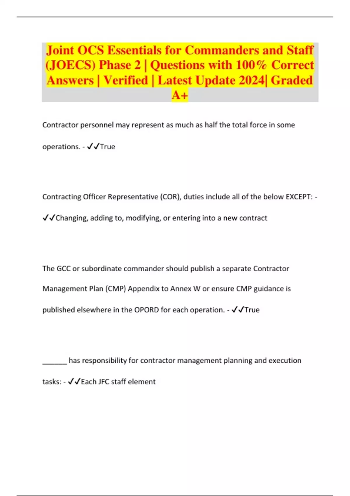 Joint OCS Essentials for Commanders and Staff (JOECS) Phase 2 | Questions with 100% Correct Answers | Verified | Latest Update 2024| Graded A+