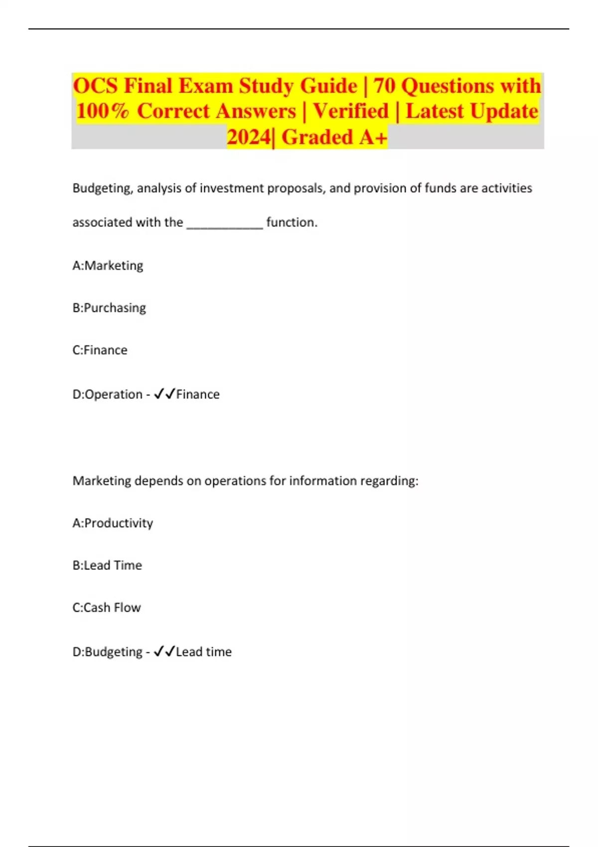 OCS Final Exam Study Guide | 70 Questions with 100% Correct Answers | Verified | Latest Update 2024| Graded A+