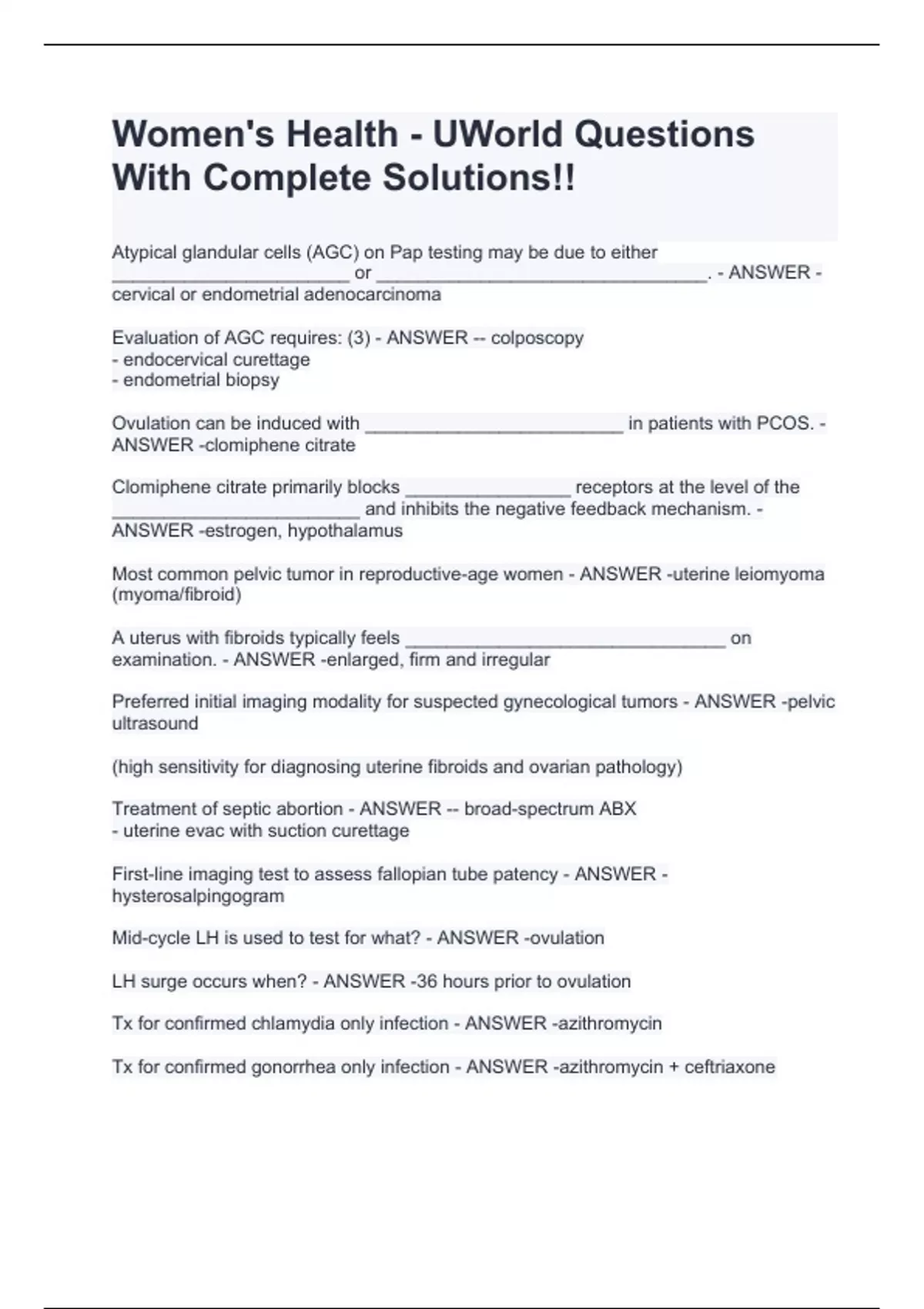 Evaluation of AGC requires: (3) - ANSWER -- colposcopy - endocervical curettage - endometrial biopsy Ovulation can be induced with _________________________ in patients with PCOS. - ANSWER -clomiphene citrate Clomiphene citrate primarily blocks ________________ receptors at the level of the ________________________ and inhibits the negative feedback mechanism. - ANSWER -estrogen, hypothalamus Most common pelvic tumor in reproductive-age women - ANSWER -uterine leiomyoma (myoma/fibroid) A uterus with fibroids typically feels _______________________________ on examination. - ANSWER -enlarged, firm and irregular Preferred initial imaging modality for suspected gynecological tumors - ANSWER -pelvic ultrasound (high sensitivity for diagnosing uterine fibroids and ovarian pathology) Treatment of septic abortion - ANSWER -- broad-spectrum ABX - uterine evac with suction curettage First-line imaging test to assess fallopian tube patency - ANSWER -hysterosalpingogram Mid-cycle LH is used to test for what? - ANSWER -ovulation LH surge occurs when? - ANSWER -36 hours prior to ovulation