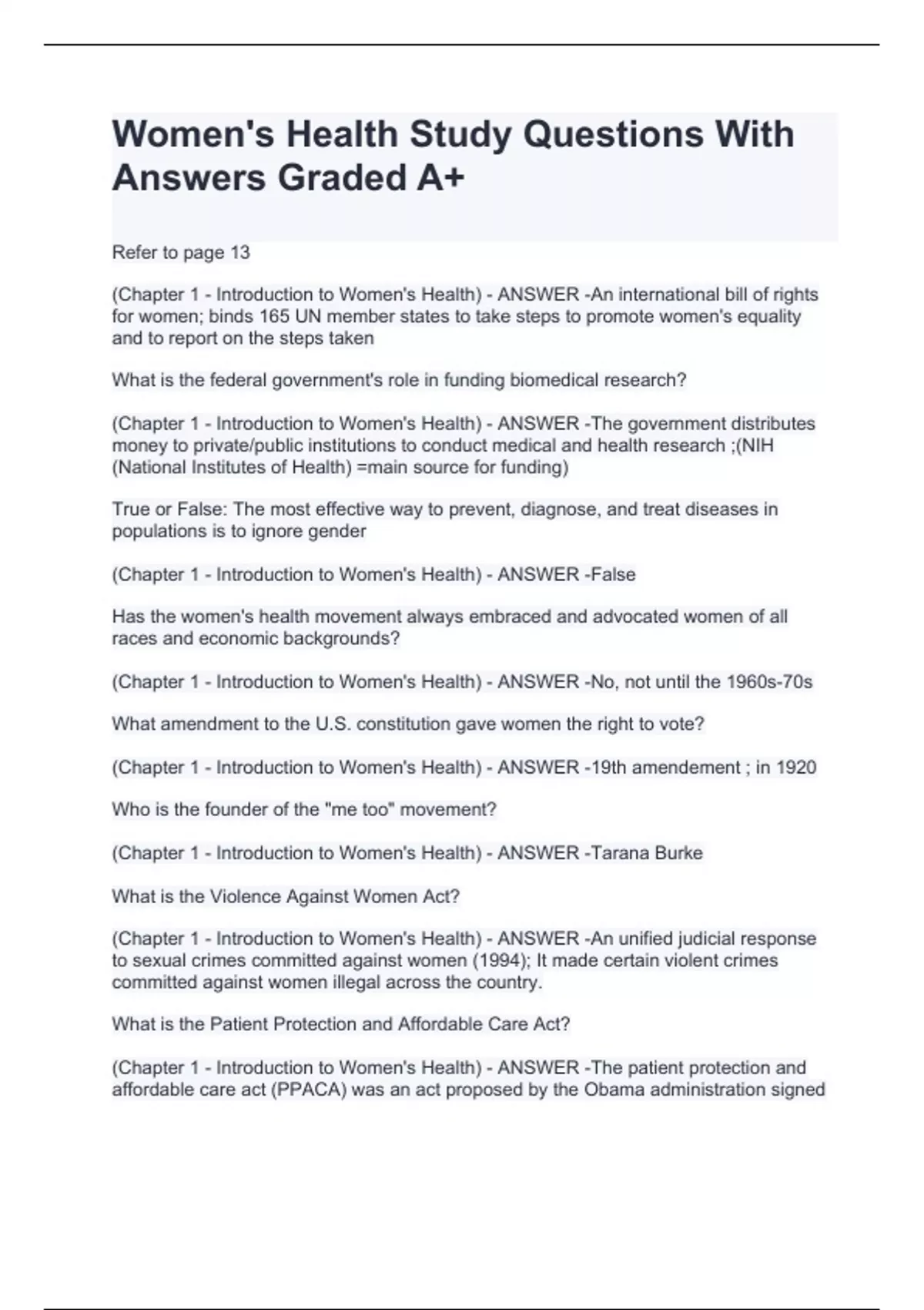 What is the federal government's role in funding biomedical research? (Chapter 1 - Introduction to Women's Health) - ANSWER -The government distributes money to private/public institutions to conduct medical and health research ;(NIH (National Institutes of Health) =main source for funding) True or False: The most effective way to prevent, diagnose, and treat diseases in populations is to ignore gender (Chapter 1 - Introduction to Women's Health) - ANSWER -False Has the women's health movement always embraced and advocated women of all races and economic backgrounds? (Chapter 1 - Introduction to Women's Health) - ANSWER -No, not until the 1960s-70s What amendment to the U.S. constitution gave women the right to vote? (Chapter 1 - Introduction to Women's Health) - ANSWER -19th amendement ; in 1920 Who is the founder of the "me too" movement? (Chapter 1 - Introduction to Women's Health) - ANSWER -Tarana Burke What is the Violence Against Women Act? (Chapter 1 - Introduction to Women's Health) - ANSWER -An unified judicial response to sexual crimes committed against women (1994); It made certain violent crimes committed against women illegal across the country. What is the Patient Protection and Affordable Care Act? (Chapter 1 - Introduction to Women's Health) - ANSWER -The patient protection and affordable care act (PPACA) was an act proposed by the Obama administration signed