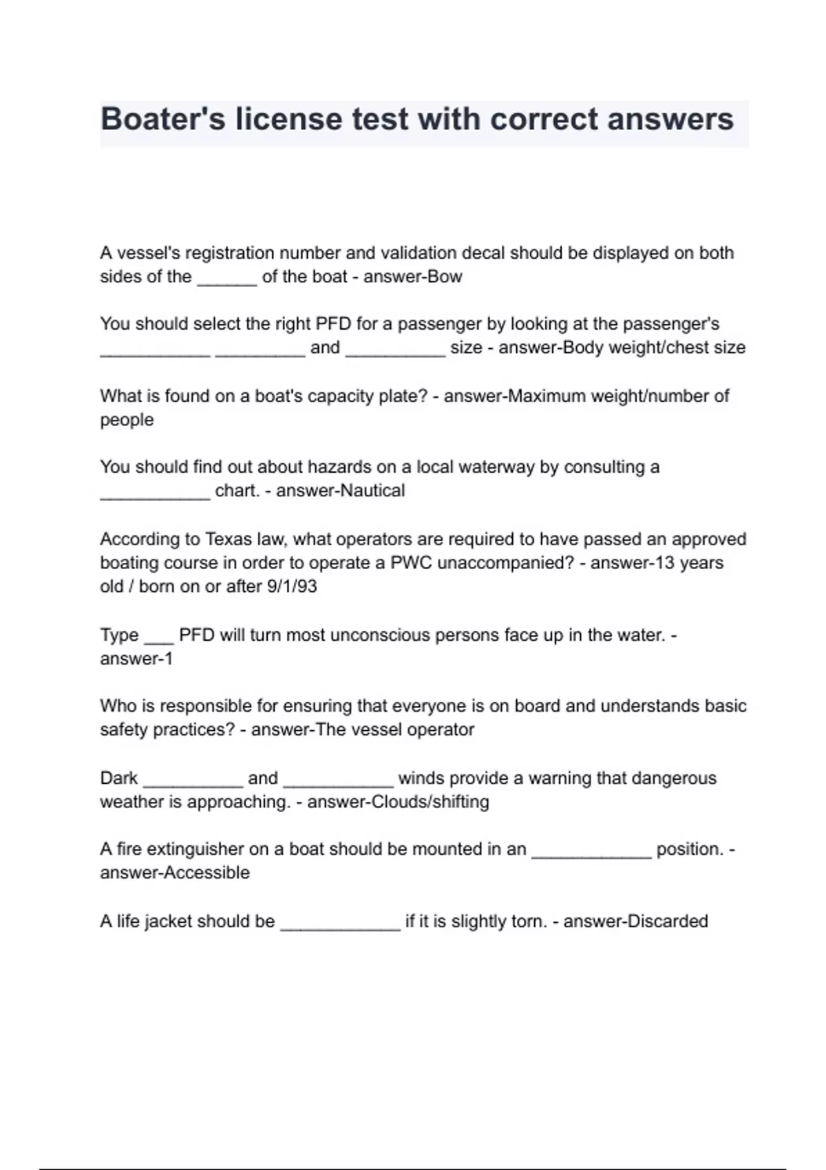 Boater's license test with correct answers