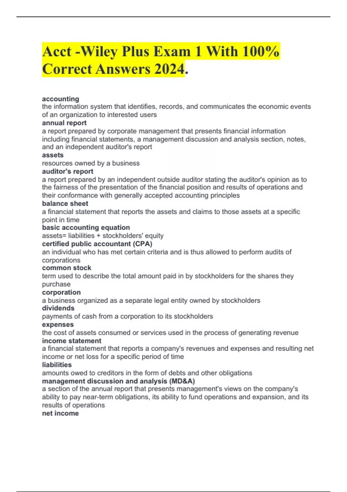 Acct -Wiley Plus Exam 1 With 100% Correct Answers 2024. accounting the information system that identifies, records, and communicates the economic events of an organization to interested users annual report a report prepared by corporate management that presents financial information including financial statements, a management discussion and analysis section, notes, and an independent auditor's report assets resources owned by a business auditor's report a report prepared by an independent outside auditor stating the auditor's opinion as to the fairness of the presentation of the financial position and results of operations and their conformance with generally accepted accounting principles balance sheet a financial statement that reports the assets and claims to those assets at a specific point in time basic accounting equation assets= liabilities + stockholders' equity