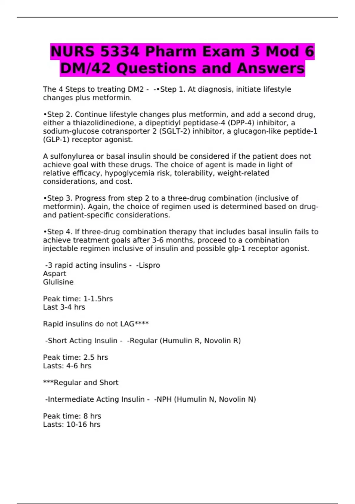 NURS 5334 Pharm Exam 3 Mod 6 DM/42 Questions and Answers