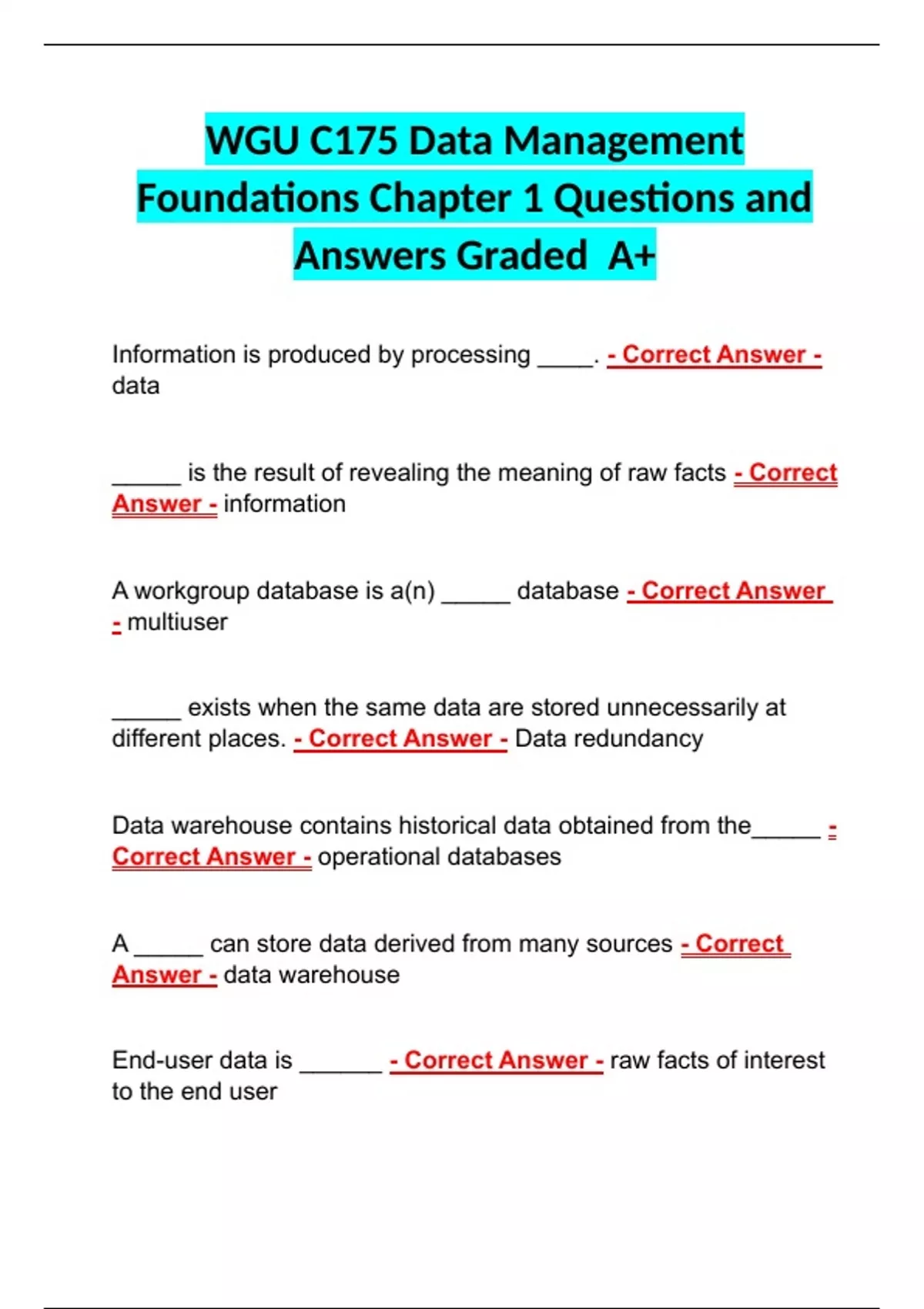 WGU C175 Data Management Foundations Chapter 1 Questions and Answers Graded A+ WGU C175 Data Management Foundations Chapter 1 Questions and Answers Graded A+ WGU C175 Data Management Foundations Chapter 1 Questions and Answers Graded A+