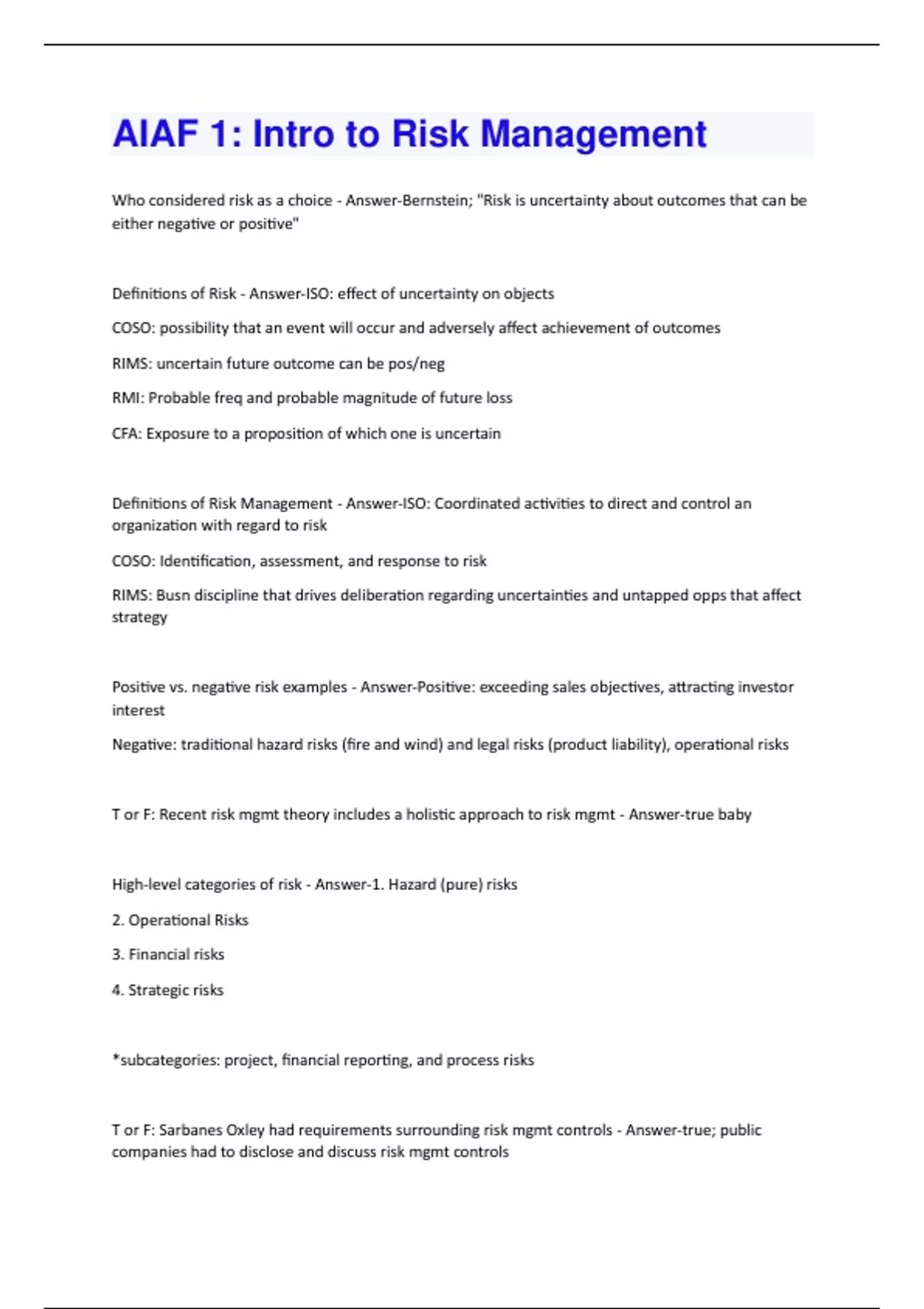 Who considered risk as a choice - Answer-Bernstein; "Risk is uncertainty about outcomes that can be either negative or positive" Definitions of Risk - Answer-ISO: effect of uncertainty on objects COSO: possibility that an event will occur and adversely affect achievement of outcomes RIMS: uncertain future outcome can be pos/neg RMI: Probable freq and probable magnitude of future loss CFA: Exposure to a proposition of which one is uncertain Definitions of Risk Management - Answer-ISO: Coordinated activities to direct and control an organization with regard to risk COSO: Identification, assessment, and response to risk RIMS: Busn discipline that drives deliberation regarding uncertainties and untapped opps that affect strategy Positive vs. negative risk examples - Answer-Positive: exceeding sales objectives, attracting investor interest Negative: traditional hazard risks (fire and wind) and legal risks (product liability), operational risks T or F: Recent risk mgmt theory includes a holistic approach to risk mgmt - Answer-true baby High-level categories of risk - Answer-1. Hazard (pure) risks 2. Operational Risks 3. Financial risks 4. Strategic risks *subcategories: project, financial reporting, and process risks T or F: Sarbanes Oxley had requirements surrounding risk mgmt controls - Answer-true; public companies had to disclose and discuss risk mgmt controlsWhat is historically the most widely practiced type of risk mgmt? - Answer--Risk mgmt of accidental losses Example of technology to manage risks that actually ended up increasing risk - Answer--Derivatives to manage exchange rate or supply chain risks World Economic Forum's four critical connectors in regard to risk interconnection: - Answer-1. Severe income disparity (economic) 2. Major systematic financial failure (economic) 3. Unforeseen negative consequences of regulation (economic) 4. Extreme volatility in energy and agri prices (economic) Which risk management techniques benefit the overall economy? - Answer--Risk mitigation and risk transfer -Ex: Insurance can prevent a busn from failure after a Cat and the unemployment that it would cause Systemic Risk - Answer--The potential for a major disruption in the function of an entire market or financial system. Benefits of Risk Mgmt for an Organization - Answer-1. Reduce cost of hazard risk 2. Reduce deterrence effects of hazard risks 3. Reduce downside risk 4. Manage the downside of risk 5. Intelligent risk taking 6. Max profitability 7. Holistic risk mgmt 8. Legal/reg requirements An organization's **cost of risk** is the total of: - Answer--Accidental losses not reimbursed by insurance -Ins premiums or expenses incurred for non-ins indemnity -Administering risk mgmt activitiesCost of Risk - Answer--The total cost incurred by an organization because of the possibility of accidental loss. Risk Mgmt benefits: Reducing deterrence effects of hazard risks - Answer--Risk mgmt reduces this by making losses less frequent, severe and more foreseeable -Resulting reduction in uncertainty benefits an org in the following ways: --Reduces mgmt's fears about potential losses --Increases profit potential w/ higher participation in investment/production activities --Makes the org a safer investment; more attractive to investors How can an organization reduce downside risks? - Answer--Stop-loss limits: have triggers in place whenever operations hit a predetermined stop-loss limit -Hedging