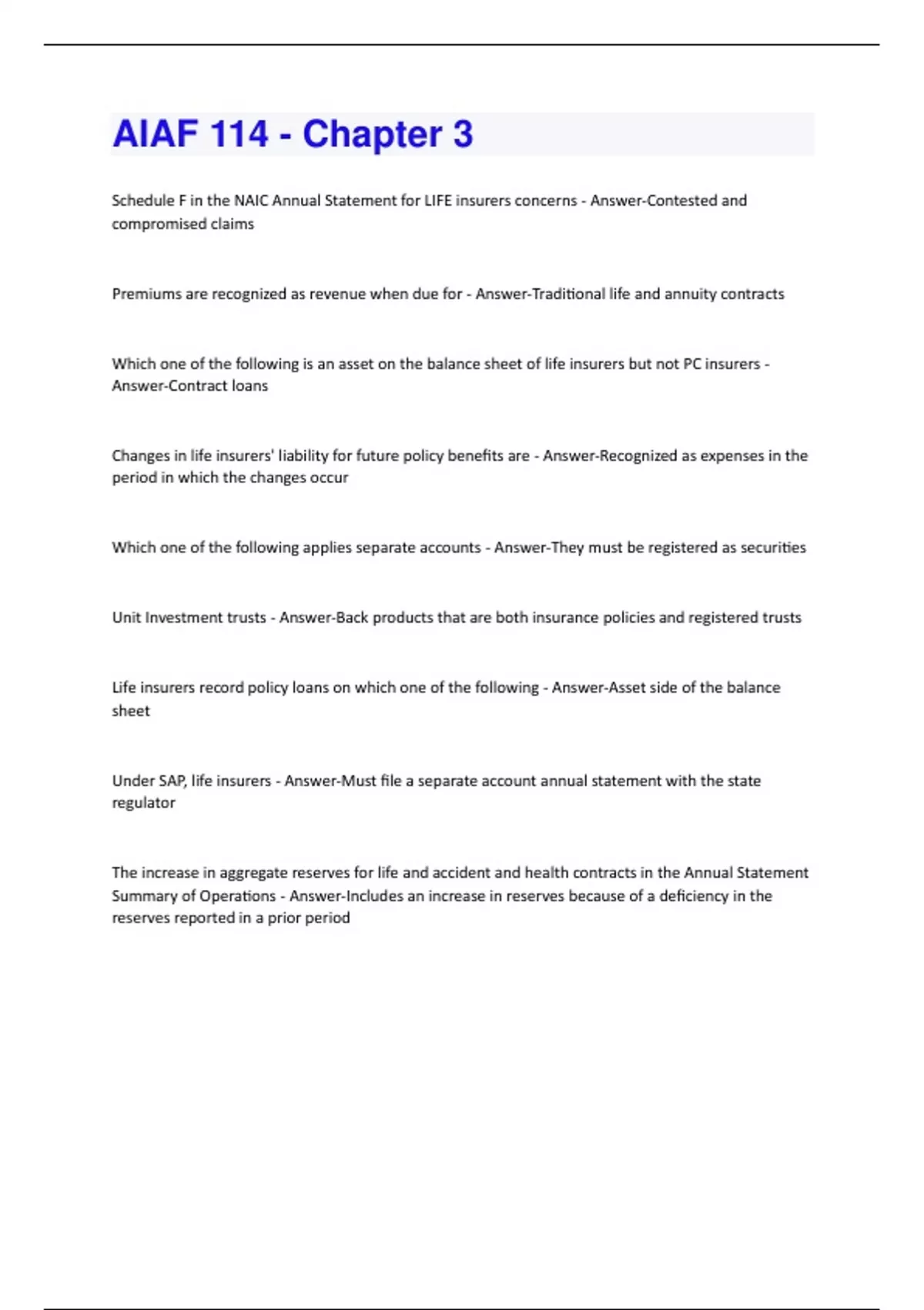 Schedule F in the NAIC Annual Statement for LIFE insurers concerns - Answer-Contested and compromised claims Premiums are recognized as revenue when due for - Answer-Traditional life and annuity contracts Which one of the following is an asset on the balance sheet of life insurers but not PC insurers - Answer-Contract loans Changes in life insurers' liability for future policy benefits are - Answer-Recognized as expenses in the period in which the changes occur Which one of the following applies separate accounts - Answer-They must be registered as securities Unit Investment trusts - Answer-Back products that are both insurance policies and registered trusts Life insurers record policy loans on which one of the following - Answer-Asset side of the balance sheet Under SAP, life insurers - Answer-Must file a separate account annual statement with the state regulator The increase in aggregate reserves for life and accident and health contracts in the Annual Statement Summary of Operations - Answer-Includes an increase in reserves because of a deficiency in the reserves reported in a prior period